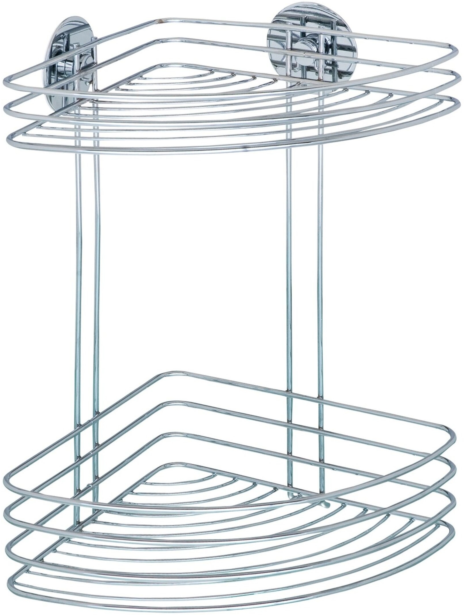 Das WENKO Dusch Eckregal mit 2 Ablagen bietet eine praktische und stilvolle Lösung für Ihr Badezimmer. Dank des innovativen Turbo-Loc®-Wandbefestigungssystems können Sie das Regal mühelos ohne Schrauben, Bohren oder Dübel anbringen. Mit einer Belastbarkeit von bis zu 40 kg und einem ansprechenden Design aus verchromtem Stahl ist es sowohl funktional als auch langlebig. **Highlights** - Turbo-Loc®-Wandbefestigungssystem für einfache Montage - Keine Schrauben, Bohren oder Dübel erforderlich - Klebepad mit extrem festem Halt auf glatten Oberflächen - Rückstandslos wieder entfernbar - Belastbar bis zu 40 kg **Produkteigenschaften** - 2 Ablagekörbe für viel Stauraum - Material: verchromter Stahl - Maße (B x H x T): 26,5 x 33 x 20 cm - Solide Qualität für langlebige Nutzung - Ideale Stauraumnutzung von Raumecken