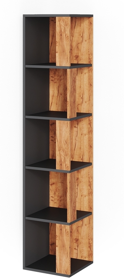 Möchten Sie Ihrem Wohnraum eine besondere Note verleihen? Dann ist das Eckregal Lio genau das Richtige für Sie! Dieses originell gestaltete Regal bietet nicht nur fünf offene Einlegeböden, sondern ist auch platzsparend in der Ecke aufgestellt und somit eine perfekte Lösung für kleine Räume. Das Eckregal Lio ist Teil einer Serie mit vielen Variationen, sodass Sie Ihr Zuhause perfekt auf Ihre Bedürfnisse abstimmen können. Ob als Eckschrank oder Bücherregal - dieses Regal macht alles möglich. Es ist nicht nur funktional, sondern auch ein echter Hingucker für jeden Raum. Schaffen Sie mit dem Eckregal Lio gemütliche Ecken in Ihrem Wohnzimmer oder Arbeitszimmer und setzen Sie Ihre Lieblingsgegenstände perfekt in Szene. Holen Sie sich mit diesem Standregal ein Stück Lebensfreude in Ihre vier Wände und genießen Sie das außergewöhnliche Design. --- **Technische Details:** **Farben:** Goldkraft Eiche, Anthrazit **Abmessungen:** 33 x 162 x 33 cm (BxHxT) **Material:** Spanplatte, 16 mm **Oberfläche:** Melaminharzbeschichtung **Gewicht brutto:** 24.9 kg **Artikelgewicht inkl. Verpackung:** 22.2 kg. **Artikelgewicht:** 21.21 kg. --- LIEFERUMFANG: Regal für Ecke, Montageanleitung, Montagematerial .