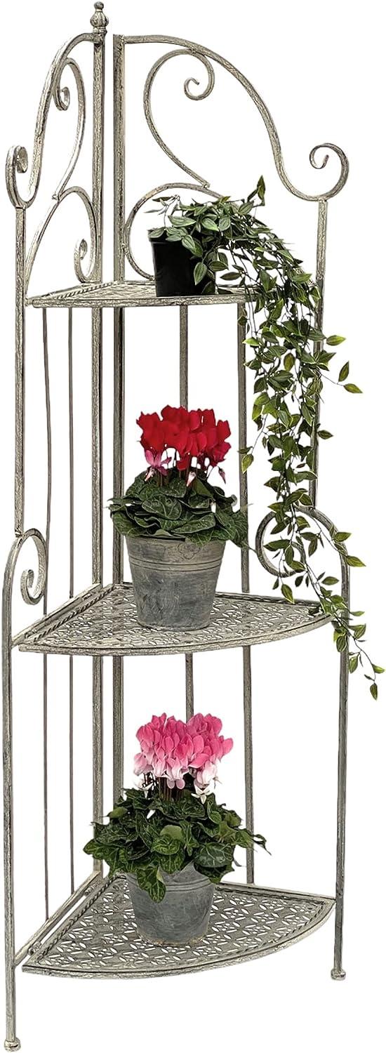 Dekoratives Eckregal im Vintage-Landhausstil mit 3 klappbaren Metallablagen. Dieses Regal bietet vielseitigen Stauraum in Bad, Wohnzimmer, Küche, Flur, Terrasse oder Balkon. Es ist aus geschmiedetem Metall gefertigt und komplett klappbar, was eine platzsparende Aufbewahrung ermöglicht. Bodenschonende Kunststoffeinlagen an den Füßen schützen Ihren Boden. **Highlights** - Vintage-Landhausstil: Dekoratives Design - Klappbare Metallablagen: Flexibilität beim Stauraum - Platzsparende Aufbewahrung: Komplett klappbar - Bodenschonende Kunststoffeinlagen: Schutz für den Boden - Antik gewischte Grau-Weiß-Farbe: Stilvolles Aussehen **Produkteigenschaften** - Material: Metall - Anzahl der Böden: 3 - Gesamthöhe: 125 cm - Tiefe: 35 cm - Breite: 35 cm - Boden-Zwischenhöhe: 39 cm / 40 cm - Gewicht: 4,6 kg