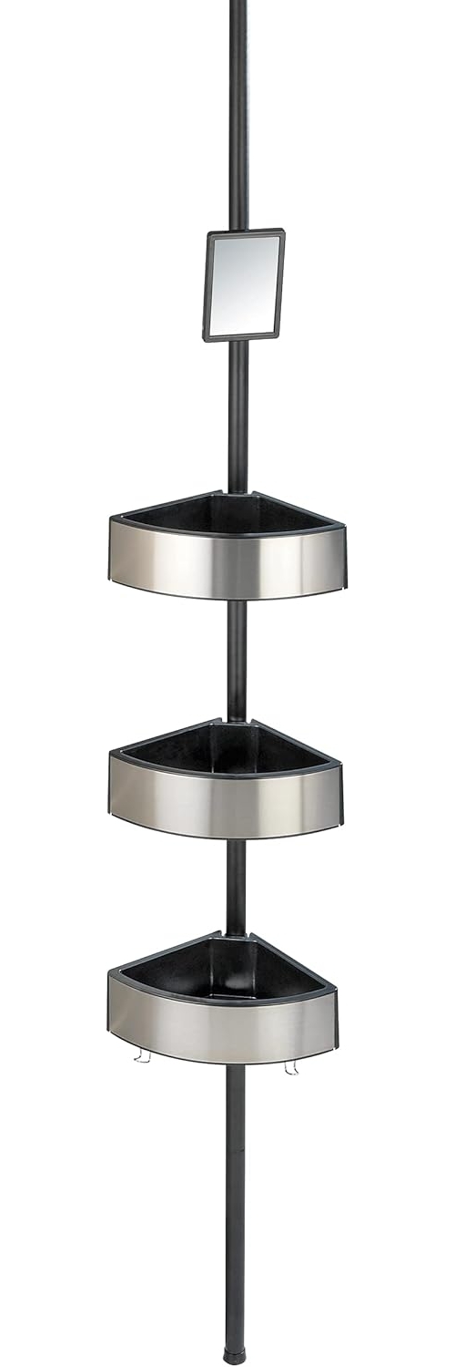 Das WENKO Duschregal Premium Big Black bietet mit drei Ablageflächen aus hochwertigem Kunststoff viel Platz für Ihre Duschutensilien. Die rostfreien Edelstahlblenden und die extra-tiefen Körbe sorgen für einen modernen Look und sicheren Halt. Mit einem höhenverstellbaren Teleskop von 0,70 bis 2,60 m und einem schwenkbaren, bruchsicheren Spiegel ist es die ideale Lösung für Ihr Badezimmer. Die Montage erfolgt einfach und ohne Bohren. **Highlights** - Drei Ablageflächen für viel Stauraum - Rostfreie Edelstahlblenden für Langlebigkeit - Extra-tiefe Körbe für sicheren Halt der Utensilien - Schwenkbarer, bruchsicherer Spiegel mit Antibeschlag-Eigenschaft - Höhenverstellbar von 0,70 bis 2,60 m **Produkteigenschaften** - Material: Hochwertiger Kunststoff und rostfreier Edelstahl - Rohrdurchmesser der Teleskopstange: 25 mm - Maße (B x H x T): 27,5 x 70 - 260 x 20 cm - Montage: Klemmen zwischen Boden und Decke, ohne Bohren - Garantie: 10 Jahre ab Kaufdatum, ausgenommen unsachgemäße Handhabung **Lieferumfang** - Duschregal mit drei Ablageflächen - Zwei Haken für Waschhandschuhe und Duschschwämme - Schwenkbarer Spiegel - Montageanleitung
