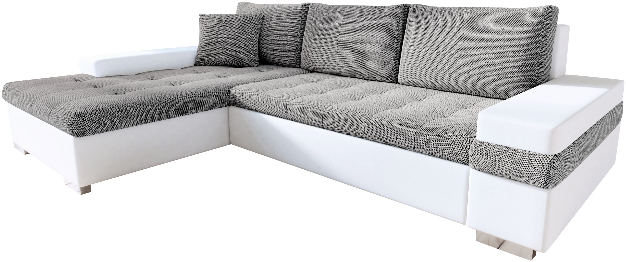 | Beschreibung | Ecksofa Bangkok Mini in der Farbgebung Soft 017 und Lawa 05 bietet Ihnen eine komfortable Lösung für Ihr Wohnzimmer. Mit einer Länge von 274 cm, einer Breite von 182 cm und einer Höhe von 83 cm ist es ideal für entspannte Abende. Die Schlaffläche von 216 x 135 cm und der praktische Bettkasten mit den Maßen 138 x 55 x 21 cm machen es zu einem vielseitigen Möbelstück. **Highlights** - Ausziehbares Ecksofa mit Schlaffunktion - Praktischer Bettkasten für zusätzlichen Stauraum - Verchromte Füße für einen modernen Look - Rückenlehne mit beweglichen Kissen für optimalen Komfort - Inklusive Kissen-Set mit Reißverschluss (3 Rückenkissen + 1 zusätzliche) **Produkteigenschaften** - Maße (L x B x H): 274 x 182 x 83 cm - Schlaffläche: 216 x 135 cm - Bettkasten Maße (L x B x H): 138 x 55 x 21 cm - Material: Holzkonstruktion + Spanplatte, Sitzfläche aus Schaumstoff + Wellenfeder - Freistehendes Ecksofa mit überzogenem Rücken - Universelle Montage für rechte oder linke Seite **Lieferumfang** - Ecksofa Bangkok Mini - Kissen-Set (3 Rückenkissen + 1 zusätzliche) - Montageanleitung - Lieferung bis zur ersten Tür (keine Lieferung auf Inseln oder in Bergbewohnungen) - Ohne Dekoration |