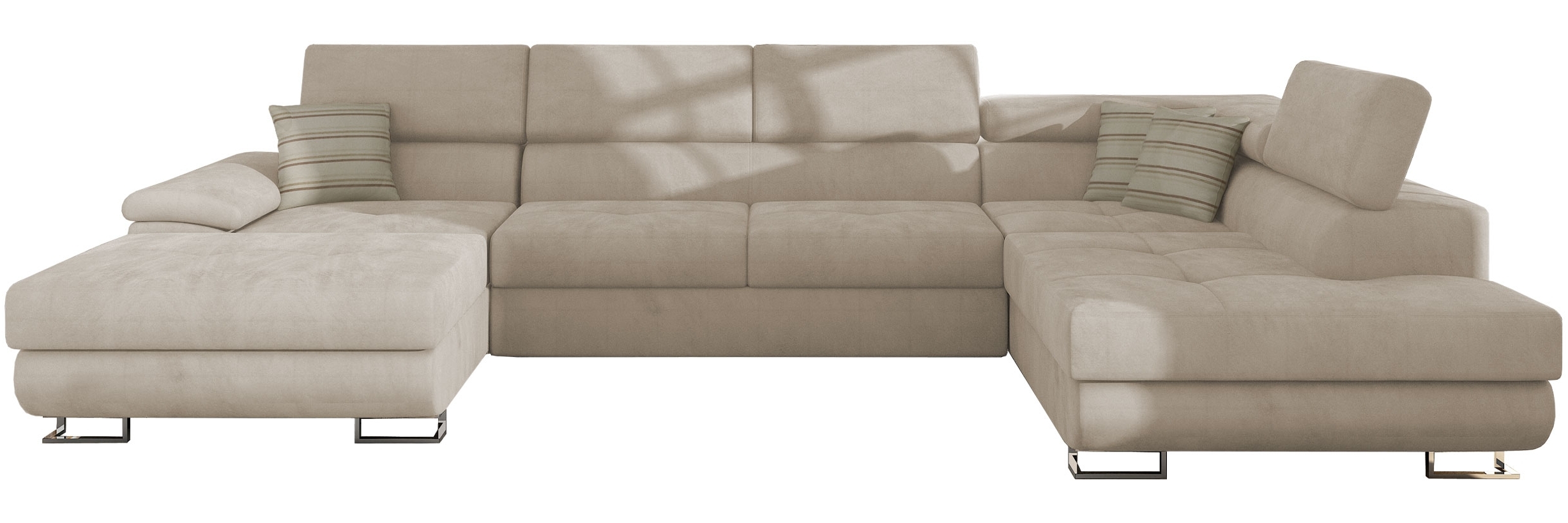 Die Wohnlandschaft Cotere Bis bietet Ihnen eine großzügige Sitzfläche mit einer Länge von 345 cm und einer Breite von 202 cm. Die Höhe variiert zwischen 71 cm und 91 cm. Mit einer Schlaffläche von 270 x 125 cm und einem praktischen Bettkasten ist sie ideal für Gästeübernachtungen. Die bequeme Sitzfläche und die verstellbaren Kopfstützen sorgen für höchsten Komfort. Das Ecksofa ist in der eleganten Farbe Uttario Velvet 2979 und Senegal 825 erhältlich. **Highlights** - Ausziehbares Ecksofa mit Schlaffunktion - Praktischer Bettkasten für zusätzlichen Stauraum - Verstellbare Kopfstützen für optimalen Komfort - Freistehendes Design mit echtem Bezug auf der Rückseite - Kissen mit Reißverschluss im Lieferumfang enthalten **Produkteigenschaften** - Maße (LxBxH): 345 x 202 x 71-91 cm - Schlaffläche: 270 x 125 cm - Bettkasten Maße (LxBxH): 174 x 92 x 18 cm - Sitzfläche: Holz-Konstruktion, Wellenfeder, Filz, Schaumstoff T-2844 (Dicke: 9 cm), Polsterwatte - Lehne: Holz-Konstruktion, Faserplatte, Schaumstoff T-2844 (Dicke: 7 cm), Polsterwatte - Vorderfüße: Metall Chrom, Hinterfüße: Kunststoff (Höhe: 9 cm) - Polsterlehnen fest montiert - Alle Maße sind ca. Maße **Lieferumfang** - Wohnlandschaft Cotere Bis - Kissen mit Reißverschluss - Ohne Dekoration