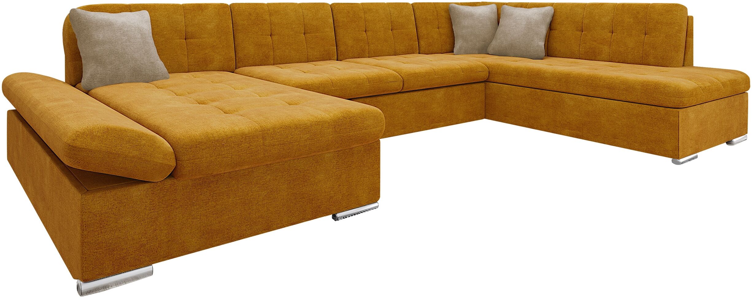 Die Wohnlandschaft Bergen ist ein elegantes Ecksofa, das mit einer Länge von 345 cm und einer Breite von 205 cm großzügigen Platz bietet. Die Höhe beträgt 76 cm, und die Schlaffläche misst 302 x 128 cm. Mit einem praktischen Bettkasten und einer robusten Holzkonstruktion ist dieses Sofa sowohl funktional als auch stilvoll. Die verchromten Plastikfüße und die regulierbaren Armlehnen runden das moderne Design ab. **Highlights** - Ausziehbares Ecksofa mit Schlaffunktion - Praktischer Bettkasten für zusätzlichen Stauraum - Robuste Holzkonstruktion für Langlebigkeit - Regulierte Armlehne für individuellen Komfort - Freistehendes Design mit echtem Rückenbezug **Produkteigenschaften** - Maße (LxBxH): 345 x 205 x 76 cm - Schlaffläche: 302 x 128 cm - Bettkasten Größe: Höhe: 23 cm, Breite: 73 cm, Länge: 147 cm - Sitzfläche: Polyurethanschaumstoff + Wellenfeder - Verchromte Plastikfüße - Polsterlehnen fest montiert - Kissen mit Reißverschluss, im Lieferumfang enthalten **Lieferumfang** - Ecksofa Bergen - Kissen (mit Reißverschluss) - Ohne Dekoration