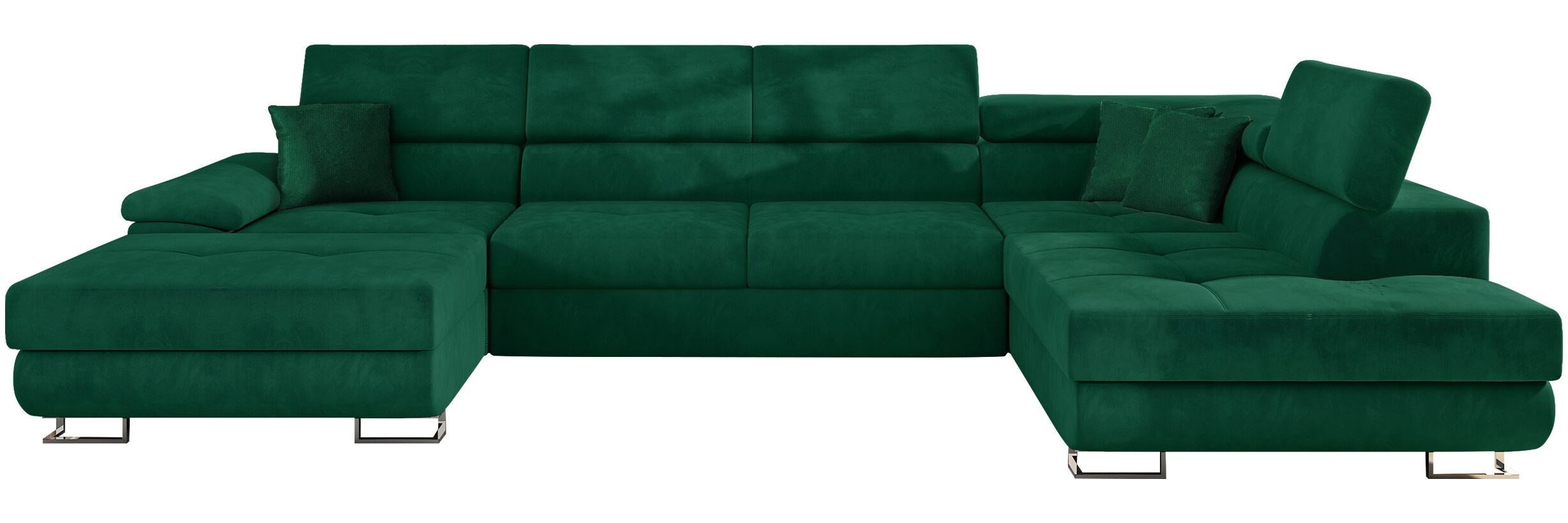 Die Wohnlandschaft Cotere Bis überzeugt durch ihr modernes Design und hohen Sitzkomfort. Mit einer Länge von 345 cm und einer Breite von 202 cm bietet sie ausreichend Platz für gesellige Abende. Die Schlaffläche von 270 x 125 cm und der praktische Bettkasten machen sie ideal für Übernachtungsgäste. Die verstellbaren Kopfstützen und die weiche Sitzfläche sorgen für zusätzlichen Komfort. **Highlights** - Ausziehbares Ecksofa mit Schlaffunktion - Praktischer Bettkasten für zusätzlichen Stauraum - Verstellbare Kopfstützen für individuellen Komfort - Freistehendes Design mit echtem Rückenbezug - Kissen mit Reißverschluss im Lieferumfang enthalten **Produkteigenschaften** - Maße (LxBxH): 345 x 202 x 71-91 cm - Schlaffläche: 270 x 125 cm - Bettkasten Maße (LxBxH): 174 x 92 x 18 cm - Sitzfläche: Holz-Konstruktion, Wellenfeder, Filz, Schaumstoff T-2844 (Dicke: 9 cm), Polsterwatte - Lehne: Holz-Konstruktion, Faserplatte, Schaumstoff T-2844 (Dicke: 7 cm), Polsterwatte - Vorderfüße: Metall Chrom, Hinterfüße: Kunststoff (Höhe: 9 cm) - Polsterlehnen fest montiert - Ecksofa des Typs "U" **Lieferumfang** - Wohnlandschaft Cotere Bis - Kissen (mit Reißverschluss) - Ohne Dekoration