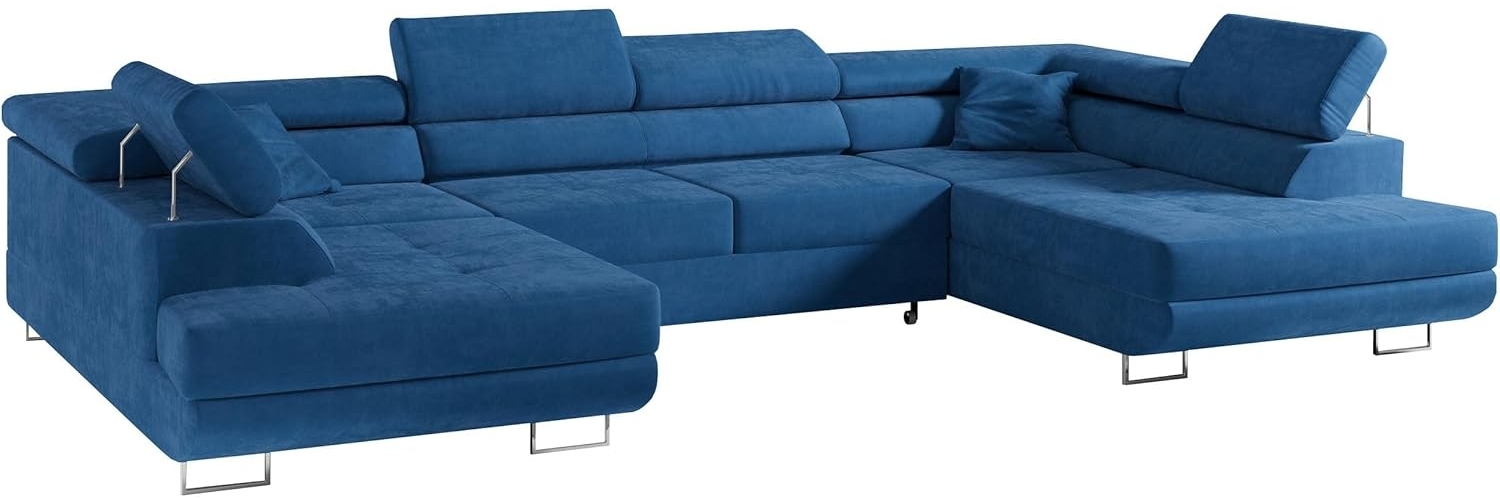 Das GUSTAW-U Ecksofa in Marineblau Velours vereint Komfort und Stil in einem eleganten Design. Mit einer Breite von 340 cm, einer Tiefe von 205 cm und einer Gesamthöhe von 88 cm bietet es ausreichend Platz für Entspannung und gesellige Abende. Die Schlaffläche von 125 x 260 cm verwandelt das Sofa mühelos in einen bequemen Schlafplatz. Hochwertige Materialien und eine durchdachte Konstruktion garantieren Langlebigkeit und Funktionalität. **Highlights** - Freistehendes Ecksofa mit elegantem Design - Schlaffunktion für zusätzlichen Schlafplatz - Eingebaute Bettkästen für praktischen Stauraum - Bewegliche Kopfstützen für individuellen Komfort - Hochwertige Materialien für langanhaltende Nutzung **Produkteigenschaften** - Maße (HxBxT): 88 x 340 x 205 cm - Sitzhöhe: 44 cm - Schlaffläche: 125 x 260 cm - Rahmen aus stabilen Holzplatten - Wellfeder für optimale Unterstützung - Bettkasten aus Laminatplatte - Rückseitig mit Stoff gepolstert - Hohe Beine für einfachere Reinigung und modernes Aussehen