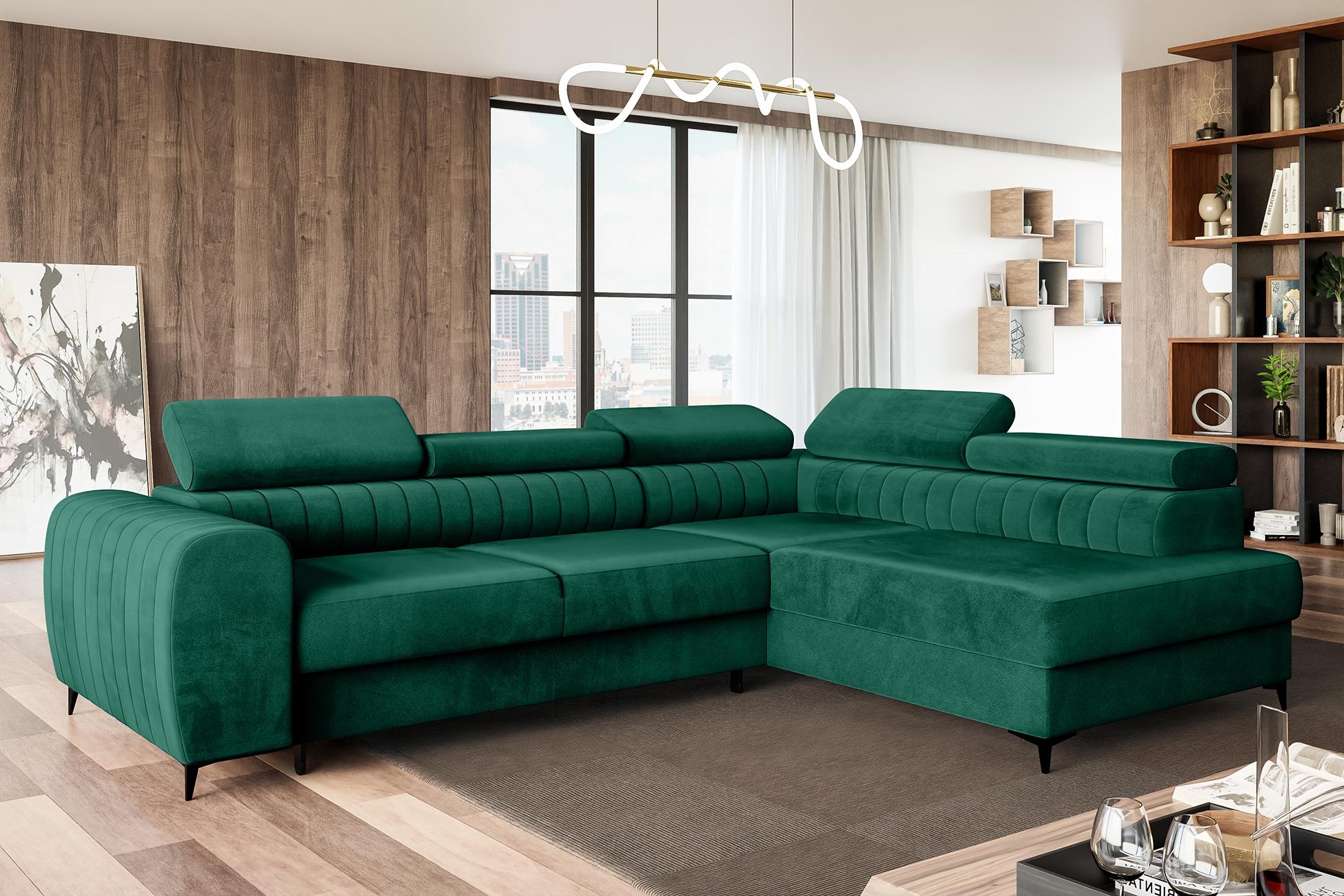 MEBLINI Schlafcouch mit Bettkasten - PORTO - ist die perfekte Lösung für Ihr Wohnzimmer. Mit den Abmessungen 269 x 204 x 72 cm bietet dieses grüne Samt-Ecksofa nicht nur Platz für bis zu vier Personen, sondern verwandelt sich dank der praktischen Schlaffunktion in ein komfortables Bett. Der Bettkasten mit Federmechanismus ermöglicht eine mühelose Aufbewahrung von Bettwäsche und Kissen. Genießen Sie zudem die Relaxfunktion mit verstellbaren Kopfstützen für optimalen Komfort. **Highlights** - Praktische Schlaffunktion für zusätzlichen Schlafplatz - Bettkasten mit Federmechanismus für müheloses Öffnen - Sitzmöglichkeiten für bis zu 4 Personen - Komfortable Relaxfunktion mit verstellbaren Kopfstützen - Strapazierfähiger Velours-Bezugsstoff (100.000 Martindale-Zyklen) **Produkteigenschaften** - Abmessungen: Breite: 269 cm, Tiefe: 204 cm, Höhe: 72 cm - Material: Grüner Samt - Robuste Konstruktion für jahrelangen Gebrauch - Schmutzabweisend und haustierfreundlich **Lieferumfang** - Schlafsofa mit Bettkasten - Montageanleitung - Montageelemente - Lieferung durch spezialisiertes Transportunternehmen (kein Rauftragen und Montage)