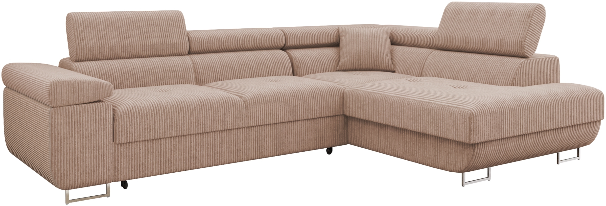Ecksofa Torezio Cord (Farbe: Poso 52, Seite: Rechts) vereint Komfort und Funktionalität. Mit einer Länge von 274 cm, einer Breite von 203 cm und einer Höhe von 70 - 90 cm bietet es ausreichend Platz für Entspannung. Die Schlaffläche von 198 x 125 cm und der praktische Bettkasten mit den Maßen 173 x 92 x 17 cm machen es ideal für Übernachtungsgäste. **Highlights** - Ausziehbar für zusätzlichen Platz - Mit Bettkasten für praktischen Stauraum - Schlaffunktion für Übernachtungsgäste - Einstellbare Kopfstützen für individuellen Komfort - Freistehendes Design mit echtem Bezug am Rücken **Produkteigenschaften** - Maße (L x B x H): 274 x 203 x 70 - 90 cm - Schlaffläche: 198 x 125 cm - Bettkasten Größe: 173 x 92 x 17 cm - Sitzfläche: Holz-Konstruktion, Wellenfeder, Filz, Schaumstoff T-2844 (Dicke: 10 cm), Polsterwatte - Lehne: Holz-Konstruktion, Faserplatte, Schaumstoff T-2844 (Dicke: 8 cm), Polsterwatte - Vorderfüße: Metall Chrom, Hinterfüße: Kunststoff (Höhe: 9 cm) - Polsterlehnen fest montiert **Lieferumfang** - Ecksofa Torezio Cord - Ohne Dekoration
