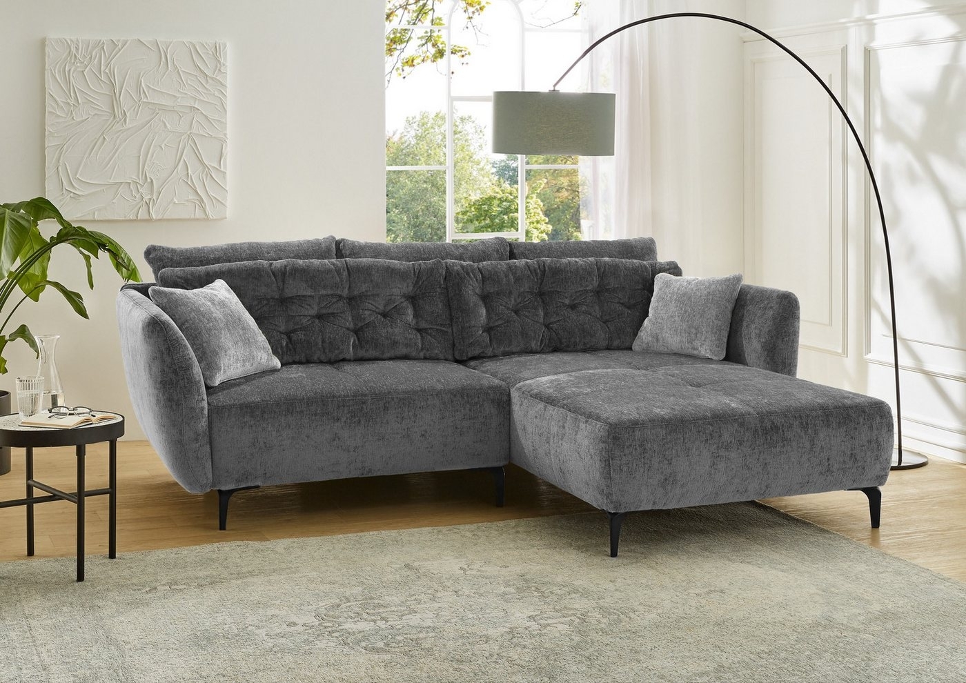 | Beschreibung | Wunderschön nostalgisch und bequem präsentiert sich das Jockenhöfer Gruppe Ecksofa Salo in L-Form. Mit seiner Wellenfederung und der beidseitig montierbaren Recamiere bietet es hohen Sitzkomfort. Die hochwertige Steppung und das zeitlose Design mit weichen Formen machen dieses Sofa zu einem stilvollen Akzent in Ihrem Wohnraum. Inklusive sind sieben Kissen, die zum Entspannen einladen. **Highlights** - Retrolook für einen nostalgischen Charme - Wellenfederung für hohen Sitzkomfort - Beidseitig montierbare Recamiere für flexible Gestaltung - Hochwertige Steppungen für ein elegantes Erscheinungsbild - Frei im Raum stellbar für vielseitige Einrichtungsmöglichkeiten **Produkteigenschaften** - L-Form - Inklusive sieben Kissen - Hochwertige Stoffauswahl - Zeitloses Design mit weichen Formen - Integrierte Wellenfederung - Schaumpolsterung **Lieferumfang** - Ecksofa Salo - Sieben Kissen |