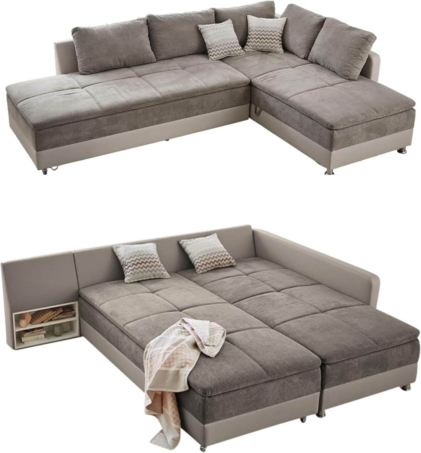 **Perfekte Verwandlung vom gemütlichen Ecksofa zum traumhaften Doppelbett!** Perfekter Sitz- und Schlafkomfort durch exzellente Polsterung im Boxspringverfahren mit integriertem Kaltschaumtopper in beiden Liegeflächen. Durch Eindrehen des Schwenkteils entsteht eine große Liegefläche, Nachtkonsole m.2 Fächern in der Rückenlehne, feststehendes Sofateil mit großem Bettkasten. **Allgemeines:** - Bezug Sitzfläche/Kissen mit hochwertigem Mikrofaserstoff - Bezug Korpus mit pflegeleichtem Kunstleder - Hochwertige Boxspringpolsterung mit Wellenunterfederung und 7-Zonen-Tonnentaschenfederkern in beiden Liegeflächen - Integrierter Kaltschaum-Topper - Angenehmer Sitz- und Schlafkomfort, geeignet als Dauerschläfer - Liegefläche entsteht durch Eindrehen des linken Schwenkteils - Großer Bettkasten im festst.rechten Sofateil - Nachtkonsole m.2 Fächern in der Rückenlehne - 5 große Rückenkissen und 2 gemusterte Zierkissen - Modische Metallfüße in Chrom - Deutscher Hersteller - Stabile Ausführung - Der Rücken ist nicht echt bezogen (Spannstoff) **Zur Info** Für die Doppelbett-Liegefläche einfach das Schwenkteil zum feststehenden Sofateil schieben (Achtung, Breite von ca. 330 cm benötigt) und beide Elemente mit Vorrichtung fixieren. An den Korpus-Elementen befinden sich Vorrichtungen dafür, diese verhindern das Verrutschen der beiden Elemente. **Maße (ca.):** - Breite: 306 cm - Tiefe: 223 cm - Schenkelmaß: 306x223 cm - Höhe (mit/ohne Kissen): 95/76 cm - Sitzhöhe: 51 cm - Sitztiefe feststehendes Sofateil mit Bettkasten (m./o.Kissen): 71/91 cm - Sitztiefe Schwenkteil (m./o.Kissen): 74/94 cm - Liegefläche: 183x203 cm - Fußhöhe: 7 cm - Bettkasteninnenmaß: 197x89x16 cm **Textilkennzeichnung:** - Sitz, gr.u.kl.Kissen: 100% Polyester (PES) - Korpus: 100% Polyurethan (PU)