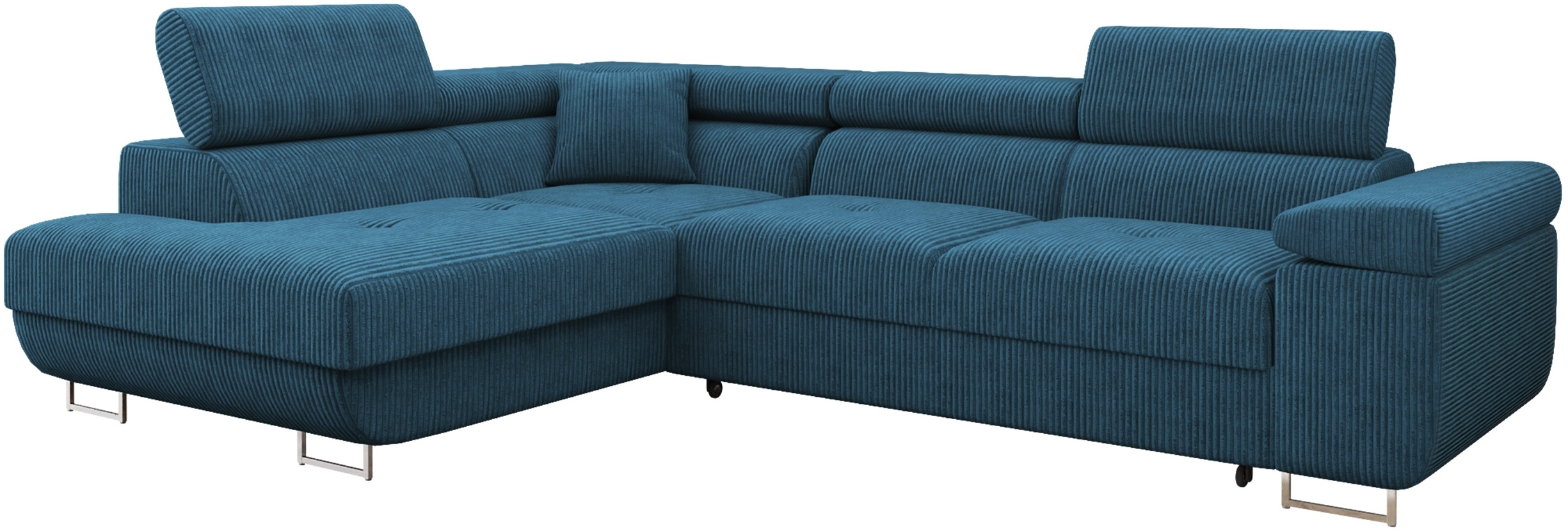 Ecksofa Torezio Cord (Farbe: Poso 05, Seite: Links) vereint Komfort und Funktionalität. Mit einer Länge von 274 cm, einer Breite von 203 cm und einer variablen Höhe von 70 bis 90 cm bietet es ausreichend Platz für Entspannung. Die Schlaffläche misst 198 x 125 cm und der integrierte Bettkasten hat die Maße 173 x 92 x 17 cm. Die hochwertige Konstruktion sorgt für einen hohen Sitzkomfort. **Highlights** - Ausziehbar mit Schlaffunktion für zusätzlichen Schlafplatz - Integrierter Bettkasten für praktischen Stauraum - Einstellbare Kopfstützen für individuellen Komfort - Freistehendes Design mit echt bezogenem Rücken - Hochwertige Materialien für Langlebigkeit und Bequemlichkeit **Produkteigenschaften** - Maße (L x B x H): 274 x 203 x 70 - 90 cm - Schlaffläche: 198 x 125 cm - Bettkasten Größe: 173 x 92 x 17 cm - Sitzfläche: Holz-Konstruktion, Wellenfeder, Filz, Schaumstoff T-2844 (Dicke: 10 cm), Polsterwatte - Lehne: Holz-Konstruktion, Faserplatte, Schaumstoff T-2844 (Dicke: 8 cm), Polsterwatte - Vorderfüße: Metall Chrom, Hinterfüße: Kunststoff (Höhe: 9 cm) - Polsterlehnen fest montiert **Lieferumfang** - Ecksofa Torezio Cord - Ohne Dekoration - Montage durch den Kunden erforderlich