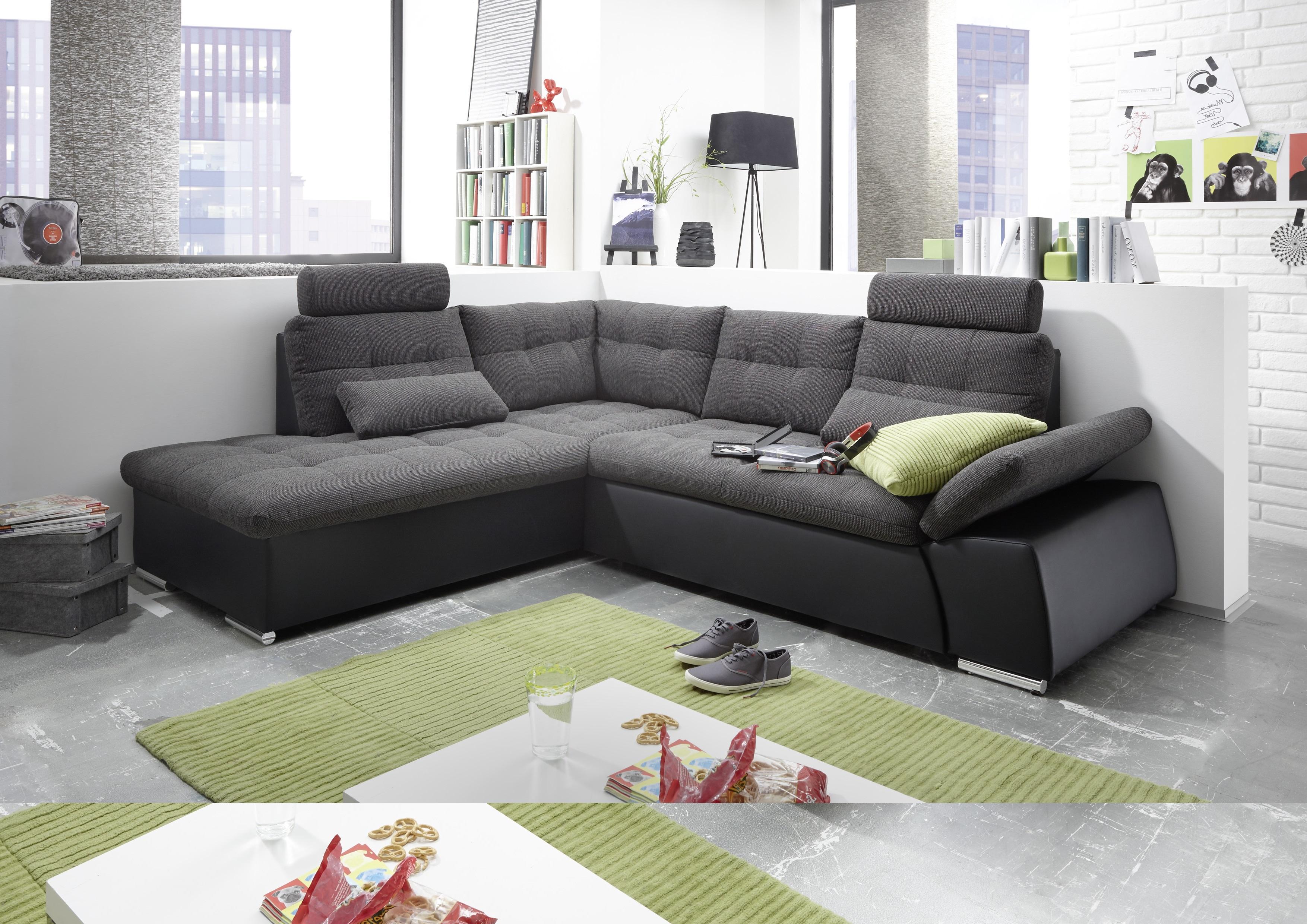 Das schwarz grau farbene Sofa Jakarta im modernen Lederlook mit Polsterung ist zugleich bequem, funktional (z.B. Armteilverstellung) und nutzt ideal den Platz, auch in kleineren Wohnzimmern. Die Couch in ansprechendem Design verleiht Ihrem Wohnbereich einen besonderen Flair. Das Sofa kommt **inklusive 5 Rückenkissen** und **2 Nierenkissen**, welche die Couch noch ansprechender und bequemer gestalten. **Zwei Kopfstützen** und **zwei verstellbare Armteile** steigern Ihren Komfort. Der **Korpus ist im Lederlook** gehalten, die Rückenlehne, die Sitzfläche sowie die Kissen sind **in Stoff**. Die Couch bietet genügend Platz zum Sitzen und Entspannen. Die extra **Schlaffunktion** macht die Eckcouch im Handumdrehen zu einer bequemen Schlafgelegenheit, nicht nur für Gäste. ### Maße (B x H x T) in cm: ca. 260 x 103 x 219 Sitzhöhe (cm) / Sitztiefe (cm): ca. 44 / 49(62) Liegefläche (cm): ca. 128 x 186 Höhe der Füße (cm): 4,5 L-Form links ### Besonderheiten: - Schlaffunktion, Bett mit Delphinfunktion - 2 x Armteilverstellung - 2 Kopfstützen Farbe: - Couch in Lederlook schwarz grau lawa inklusive 5 Rückenkissen und 2 Nierenkissen grau lawa Kissenfüllung: Flockenfüllung (- Bilder die Funktionen zeigen, können von Farbe abweichen) Grundgestell: Stabiles, hochwertiges Gestell aus Holzwerkstoffen Polsteraufbau: Sitz: Nosag - Wellenfederkernpolsterung Rücken: Schaumstoff Sitzfestigkeit: mittel Füße: Kunststoff Stoff: Lederlook:40 % Polyurethan, 40% Polyvenylchlorid; 20% Polyester Sumatra: 100 % Polyester ### Lieferumfang: - Zerlegt in 2 Pakete - Leicht verständliche Aufbauanleitung