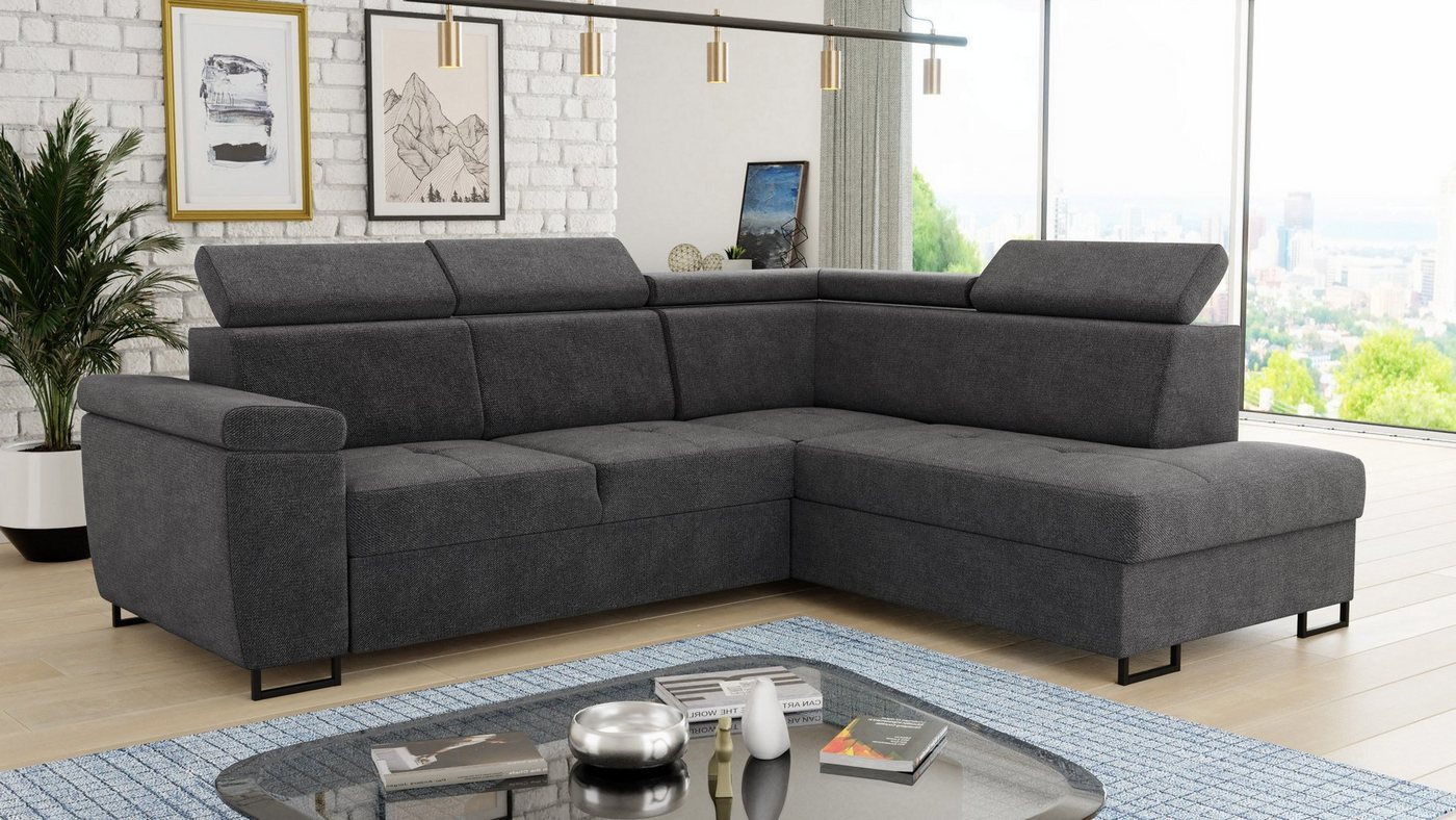 Ecksofa Natan mit Schlaffunktion und einstellbare Kopfstützen - Wohnlandschaft mit MetallfüßenCouchgarnitur, Bettkasten, Sofa (Ecksofa Rechts, Dunkelgrau (Kronos 22))
