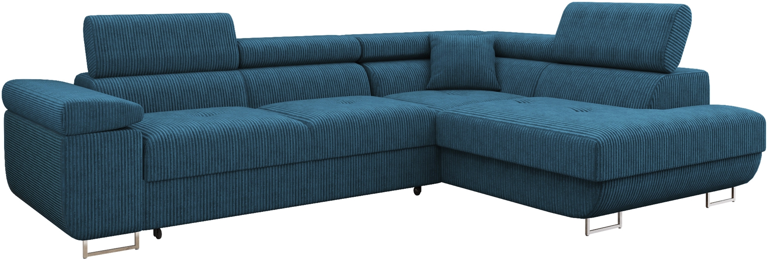 Ecksofa Torezio Cord (Farbe: Poso 05, Seite: Rechts) vereint Komfort und Funktionalität. Mit einer Länge von 274 cm, einer Breite von 203 cm und einer variablen Höhe von 70 bis 90 cm bietet es ausreichend Platz für Entspannung. Die Schlaffläche misst 198 x 125 cm und der integrierte Bettkasten hat die Maße 173 x 92 x 17 cm. Die hochwertige Konstruktion sorgt für einen hohen Sitzkomfort. **Highlights** - Ausziehbar für zusätzlichen Platz - Integrierter Bettkasten für praktischen Stauraum - Schlaffunktion für Übernachtungsgäste - Einstellbare Kopfstützen für individuellen Komfort - Freistehendes Design mit echtem Bezug am Rücken **Produkteigenschaften** - Maße (L x B x H): 274 x 203 x 70 - 90 cm - Schlaffläche: 198 x 125 cm - Bettkasten Größe: 173 x 92 x 17 cm - Sitzfläche: Holz-Konstruktion, Wellenfeder, Filz, Schaumstoff T-2844 (Dicke: 10 cm), Polsterwatte - Lehne: Holz-Konstruktion, Faserplatte, Schaumstoff T-2844 (Dicke: 8 cm), Polsterwatte - Vorderfüße: Metall Chrom, Hinterfüße: Kunststoff (Höhe: 9 cm) - Polsterlehnen fest montiert - Kissen mit Polyurethanschaumstoff befüllt **Lieferumfang** - Ecksofa Torezio Cord - Montageanleitung (Montage durch den Kunden erforderlich) - Ohne Dekoration