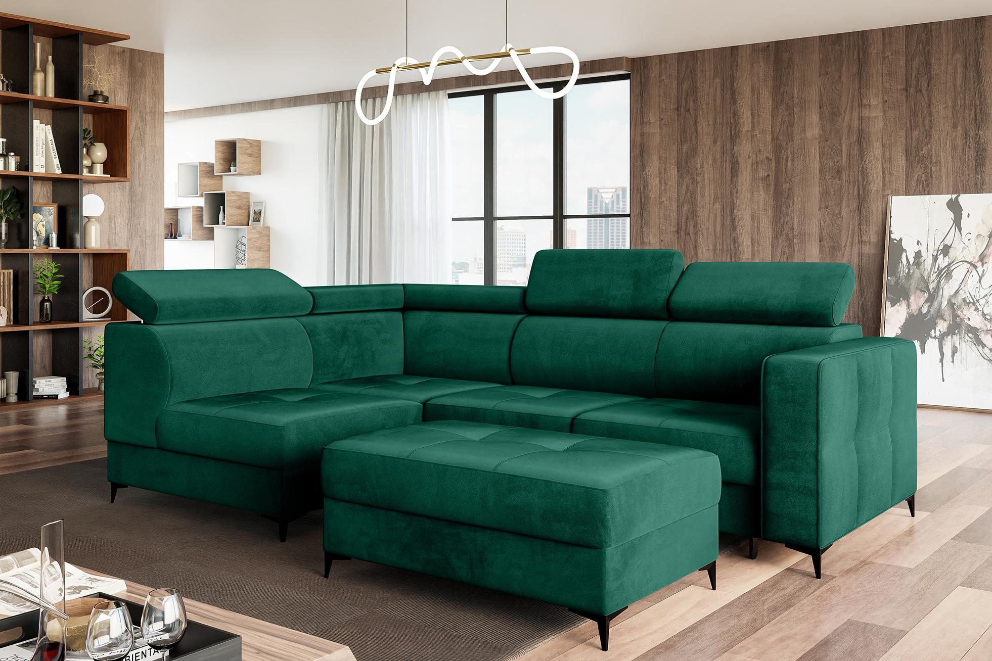 Name MEBLINI Schlafcouch mit Bettkasten - DORIAN - 263x232x89cm Links - Grün Samt - Ecksofa mit Schlaffunktion - Sofa mit Relaxfunktion und Kopfstützen - Couch L-Form - Eckcouch - Wohnlandschaft