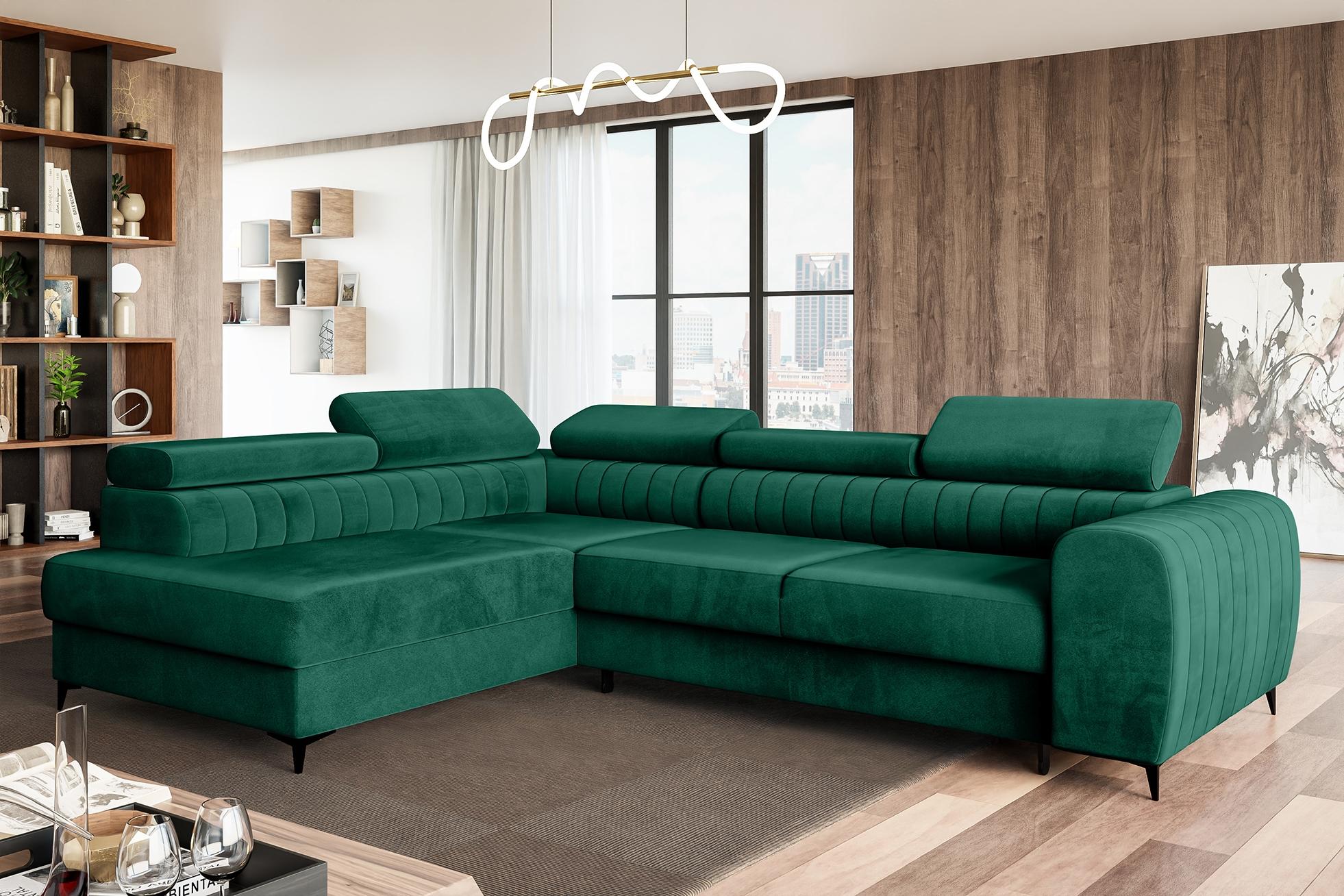 MEBLINI Schlafcouch mit Bettkasten - PORTO - ist die perfekte Lösung für Ihr Wohnzimmer. Mit den Abmessungen 269 x 204 x 72 cm bietet dieses grüne Samt-Ecksofa nicht nur Platz für bis zu vier Personen, sondern verwandelt sich dank der praktischen Schlaffunktion in ein komfortables Bett. Der Bettkasten mit Federmechanismus ermöglicht eine mühelose Aufbewahrung von Bettwäsche und Kissen. Genießen Sie zudem die Relaxfunktion mit verstellbaren Kopfstützen für optimalen Komfort. **Highlights** - Praktische Schlaffunktion für zusätzlichen Schlafplatz - Bettkasten mit Federmechanismus für müheloses Öffnen - Sitzmöglichkeiten für 4 Personen - Strapazierfähiger Velours-Bezugsstoff (100.000 Martindale-Zyklen) - Fünf verstellbare Kopfstützen für individuellen Komfort **Produkteigenschaften** - Abmessungen: Breite 269 cm, Tiefe 204 cm, Höhe 72 cm - Farbe: Grün - Material: Samt - Set-Bestandteile: Schlafsofa mit Bettkasten, Montageanleitung, Montageelemente **Lieferumfang** - Schlafsofa mit Bettkasten - Montageanleitung - Montageelemente - Lieferung durch spezialisiertes Transportunternehmen (kein Rauftragen und Montage)