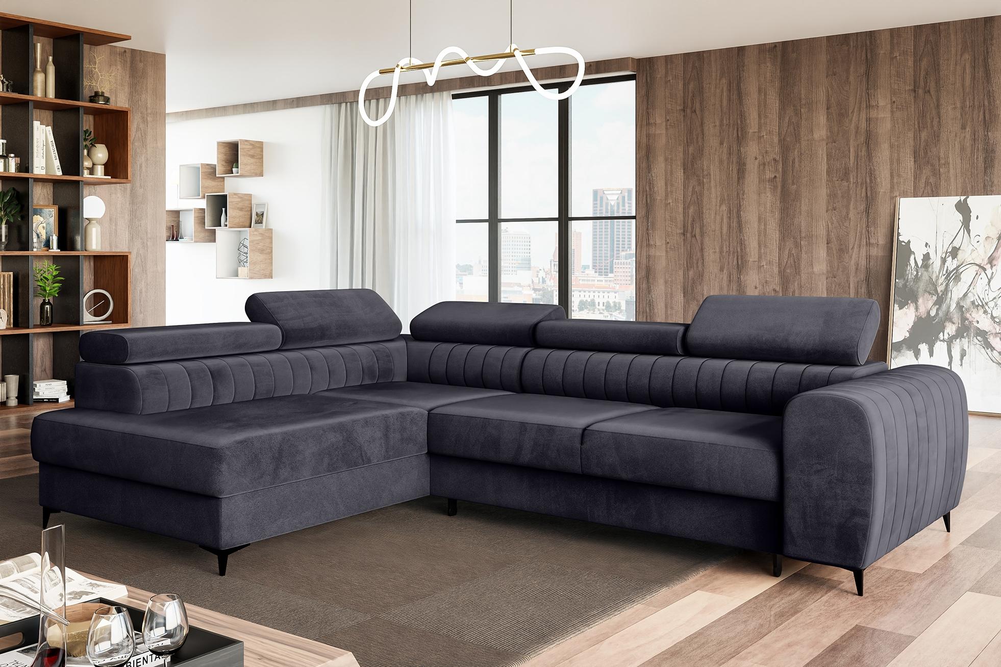 MEBLINI Schlafcouch mit Bettkasten - PORTO - ist die perfekte Lösung für Ihr Wohnzimmer. Mit den Abmessungen 269 x 204 x 72 cm bietet dieses dunkelgraue Samt-Ecksofa nicht nur Platz für bis zu vier Personen, sondern auch eine praktische Schlaffunktion. Der Bettkasten mit Federmechanismus ermöglicht eine mühelose Aufbewahrung von Bettwäsche und Kissen. Genießen Sie den Komfort der verstellbaren Kopfstützen und die strapazierfähige Velours-Oberfläche. **Highlights** - Praktische Schlaffunktion für zusätzlichen Schlafplatz - Bettkasten mit Federmechanismus für müheloses Öffnen - Sitzmöglichkeiten für 4 Personen - Komfortable Relaxfunktion mit verstellbaren Kopfstützen - Strapazierfähiger Velours-Bezugsstoff (100.000 Martindale-Zyklen) **Produkteigenschaften** - Abmessungen: Breite: 269 cm, Tiefe: 204 cm, Höhe: 72 cm - Material: Dunkelgrau Samt - Set-Bestandteile: Schlafsofa mit Bettkasten, Montageanleitung, Montageelemente - Lieferung durch spezialisiertes Transportunternehmen **Lieferumfang** - Schlafsofa mit Bettkasten - Montageanleitung - Montageelemente - Lieferung umfasst nicht das Rauftragen und Montage