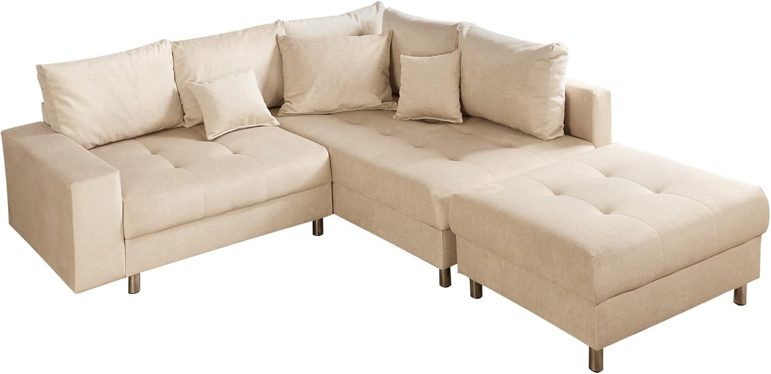 | Lieferumfang | 1x Ecksofa, 2x Rückenkissen, 2x Zierkissen, 1x Hocker |