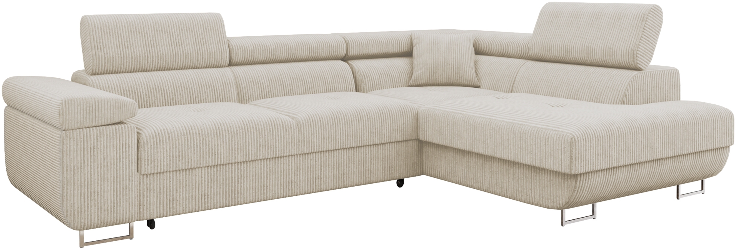 Ecksofa Torezio Cord (Farbe: Poso 100, Seite: Rechts) vereint Komfort und Funktionalität. Mit einer Länge von 274 cm, einer Breite von 203 cm und einer variablen Höhe von 70 bis 90 cm bietet es ausreichend Platz für Entspannung. Die Schlaffläche misst 198 x 125 cm und der integrierte Bettkasten hat die Maße 173 x 92 x 17 cm. Die hochwertige Konstruktion sorgt für einen hohen Sitzkomfort. **Highlights** - Ausziehbar mit Schlaffunktion - Integrierter Bettkasten für zusätzlichen Stauraum - Einstellbare Kopfstützen für optimalen Komfort - Freistehendes Design mit echtem Bezug am Rücken - Bequeme Sitzfläche aus hochwertigen Materialien **Produkteigenschaften** - Maße (L x B x H): 274 x 203 x 70 - 90 cm - Schlaffläche: 198 x 125 cm - Bettkasten Größe: 173 x 92 x 17 cm - Sitzfläche: Holz-Konstruktion, Wellenfeder, Filz, Schaumstoff T-2844 (Dicke: 10 cm), Polsterwatte - Lehne: Holz-Konstruktion, Faserplatte, Schaumstoff T-2844 (Dicke: 8 cm), Polsterwatte - Vorderfüße: Metall Chrom, Hinterfüße: Kunststoff (Höhe: 9 cm) - Polsterlehnen fest montiert **Lieferumfang** - Ecksofa Torezio Cord - Montageanleitung (Montage durch den Kunden erforderlich) - Ohne Dekoration