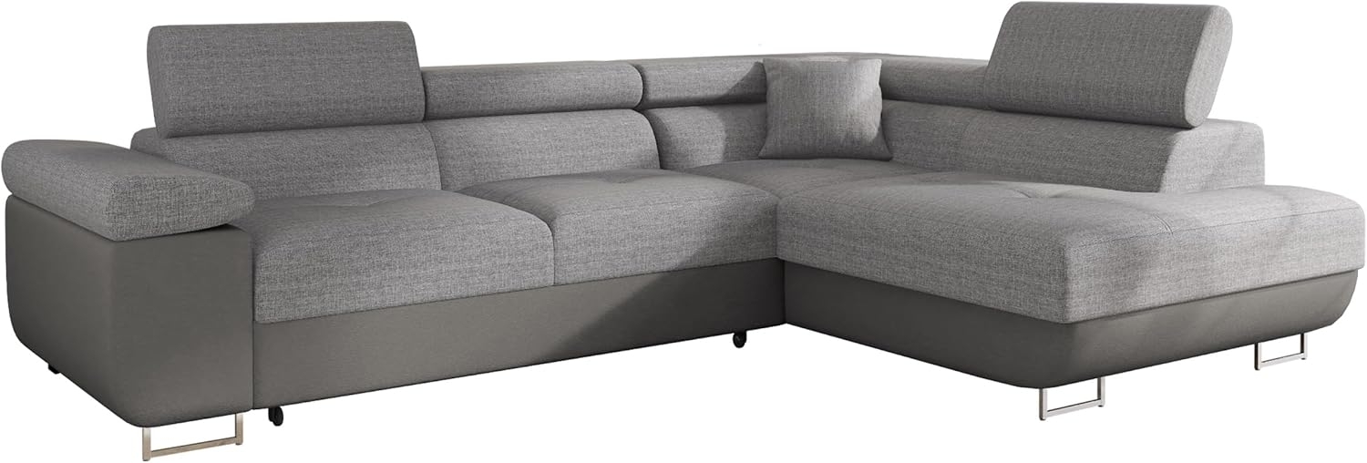 Ecksofa Torezio (Soft 029 + Lux 05, Seite: Rechts) bietet Ihnen höchsten Sitzkomfort und Funktionalität. Mit einer Länge von 274 cm, einer Breite von 203 cm und einer Höhe von 70 - 90 cm ist es ideal für Ihr Wohnzimmer. Die Schlaffläche von 198 x 125 cm und der praktische Bettkasten mit den Maßen 173 x 92 x 17 cm machen es zu einer perfekten Wahl für Gästeübernachtungen. **Highlights** - Ausziehbar mit Schlaffunktion - Praktischer Bettkasten - Einstellbare Kopfstützen - Freistehendes Design mit echtem Rückenbezug - Hoher Sitzkomfort durch weiche Polsterung **Produkteigenschaften** - Maße (LxBxH): 274 x 203 x 70 - 90 cm - Schlaffläche: 198 x 125 cm - Bettkasten Größe: 173 x 92 x 17 cm - Sitzfläche: Holz-Konstruktion, Wellenfeder, Filz, Schaumstoff T-2844 (Dicke: 10 cm), Polsterwatte - Lehne: Holz-Konstruktion, Faserplatte, Schaumstoff T-2844 (Dicke: 8 cm), Polsterwatte - Vorderfüße: Metall Chrom, Hinterfüße: Kunststoff - Polsterlehnen fest montiert **Lieferumfang** - Ecksofa Torezio - Lieferung bis in die Wohnung - Montage durch den Kunden erforderlich - Ohne Dekoration