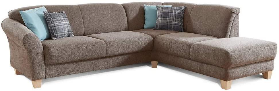 Das CAVADORE Ecksofa Gootlaand mit Ottomane rechts vereint stilvolles Design im Landhausstil mit hohem Sitzkomfort. Die großzügigen Maße von 257 x 84 x 212 cm (BxHxT) und die hochwertige Polsterung mit Federkern und Wellenunterfederung sorgen für ein gemütliches Sitzerlebnis. Der pflegeleichte Bezugsstoff Flachgewebe Paris in Taupe (braun) und die Holzfüße in Buche natur runden das ansprechende Gesamtbild ab. **Highlights** - Große Couch im Landhausstil - Federkern für hohen Sitzkomfort - Pflegeleichter Bezugsstoff - Holzfüße in Buche natur - Gemütlich und dekorativ **Produkteigenschaften** - Farbe: Taupe (braun) - Maße: 257 x 84 x 212 cm (BxHxT), Sitztiefe: 56 cm, Sitzhöhe: 45 cm - Material: Flachgewebe Paris (90 % Polyester, 10 % Polyamid) - Ausführung Fuß: Holzfüße in Buche natur **Lieferumfang** - Cavadore 5219 - Polsterecke Gootlaand mit Ottomanen rechts und Holzfüßen in Buche natur