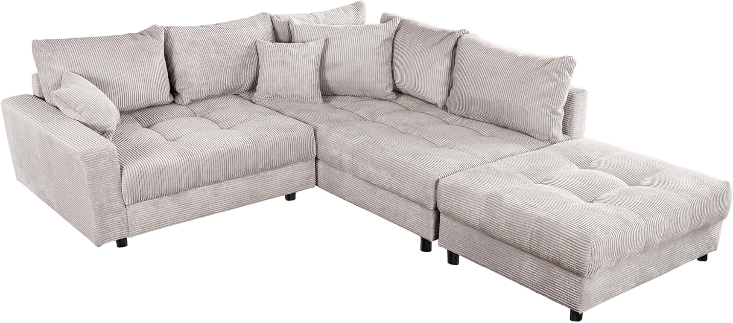 | Lieferumfang | 1x Ecksofa, 1x Hocker, Kissen (inklusive) |