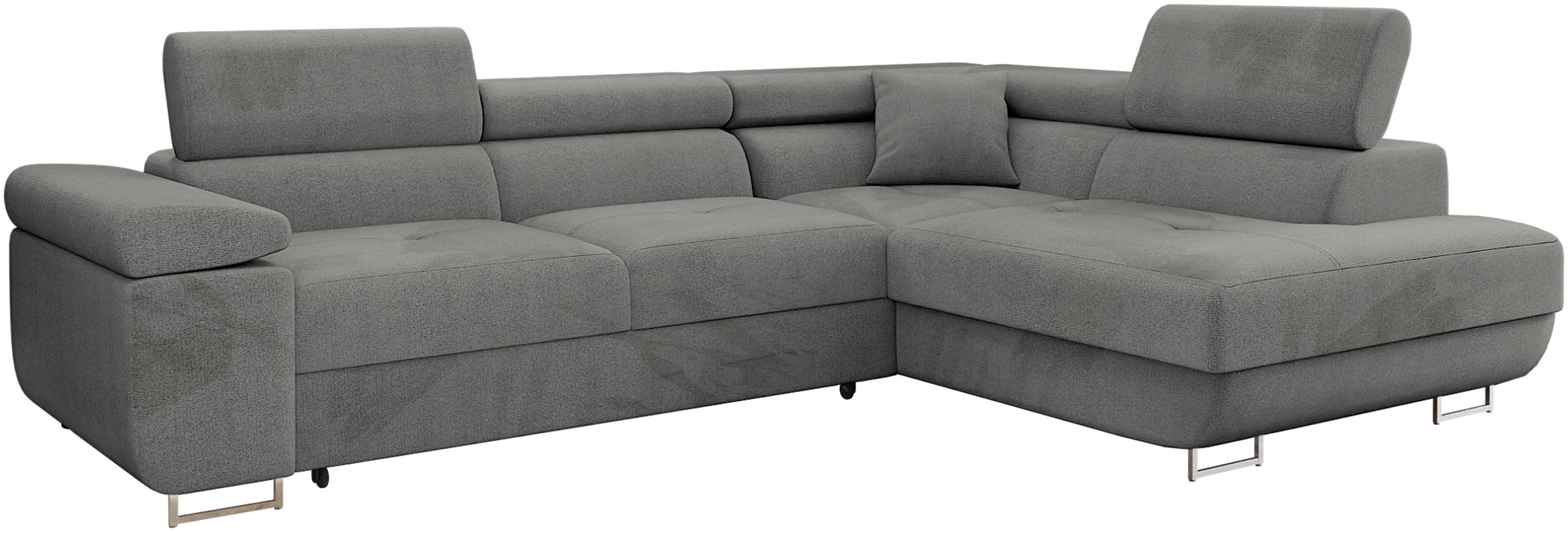 Ecksofa Torezio (Manila 16, Seite: Rechts) bietet Ihnen höchsten Sitzkomfort und Funktionalität. Mit einer Länge von 274 cm, einer Breite von 203 cm und einer variablen Höhe von 70 bis 90 cm ist es ideal für Ihr Wohnzimmer. Die Schlaffläche von 198 x 125 cm und der praktische Bettkasten mit den Maßen 173 x 92 x 17 cm machen es zu einer perfekten Wahl für Gästeübernachtungen. **Highlights** - Ausziehbar mit Schlaffunktion für zusätzlichen Schlafplatz - Praktischer Bettkasten für Stauraum - Einstellbare Kopfstützen für individuellen Komfort - Freistehendes Design mit echtem Bezug am Rücken - Hochwertige Materialien für besten Sitzkomfort **Produkteigenschaften** - Maße (L x B x H): 274 x 203 x 70 - 90 cm - Schlaffläche: 198 x 125 cm - Bettkasten Größe: 173 x 92 x 17 cm - Sitzfläche: Holz-Konstruktion, Wellenfeder, Filz, Schaumstoff T-2844 (Dicke: 10 cm), Polsterwatte - Lehne: Holz-Konstruktion, Faserplatte, Schaumstoff T-2844 (Dicke: 8 cm), Polsterwatte - Vorderfüße: Metall Chrom, Hinterfüße: Kunststoff (Höhe: 9 cm) - Polsterlehnen fest montiert **Lieferumfang** - Ecksofa Torezio - Ohne Dekoration