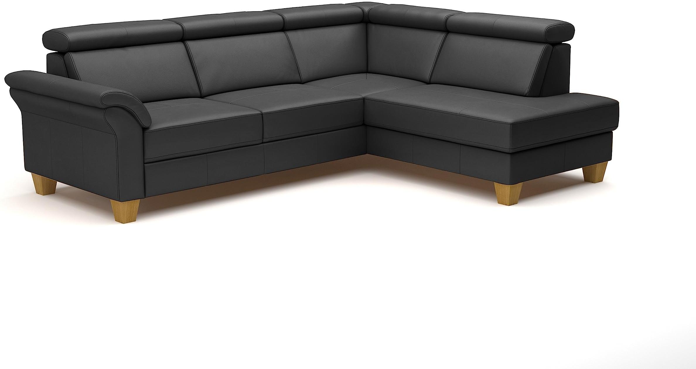 Das CAVADORE Leder-Schlafsofa Ammerland mit Ottomane vereint modernes Landhausdesign mit Funktionalität. Es bietet eine Schlaffunktion, großzügigen Stauraum und verstellbare Kopfteile. Die Polsterung aus Federkern auf Wellenunterfederung sorgt für hohen Sitzkomfort. Der Bezug aus hochwertigem Leder "Punch" in Schwarz und die stabilen Holzfüße aus eichefarbener Buche runden das Gesamtbild ab. **Highlights** - Große Eckcouch mit Schlaffunktion und Stauraum - Verstellbare Kopfteile für individuellen Komfort - Hochwertiges Leder "Punch" in Schwarz - Stabile Holzfüße aus eichefarbener Buche - Atmungsaktive Polsterschäume für hohen Sitzkomfort **Produkteigenschaften** - Maße: 245 x 84-100 x 194 cm (BxHxT) - Sitzbreite: 175 cm - Sitzhöhe: 48 cm - Sitztiefe: 51 cm - Liegefläche: 177 x 118 cm (BxT) - Stauraum: 179 x 79 x 13 cm (BxHxT) - Polsterung: Federkern auf Wellenunterfederung - Bezug: Hochwertiges Leder "Punch" (100% Echtleder) in Schwarz - Rücken und Liegefläche in Stoff (Farbe: Schwarz) - Stabile Holzfüße aus eichefarbener Buche **Lieferumfang** - CAVADORE 5402 - Echtleder Polsterecke Ammerland - Sofa 2,5-sitzig links, Ottomane rechts - Inkl. Kopfteilverstellung, Bett (Stoff) und Bettkasten - Ohne Zierkissen - Füße: Buche massiv eichefarbig (12 cm) - Rücken: Spannstoff - Lieferung in 2 Packstücken: - Packstück 1: ca. 157 x 74 x 95 cm (BxHxT), Gewicht: ca. 65 kg - Packstück 2: ca. 196 x 74 x 95 cm (BxHxT), Gewicht: ca. 72 kg