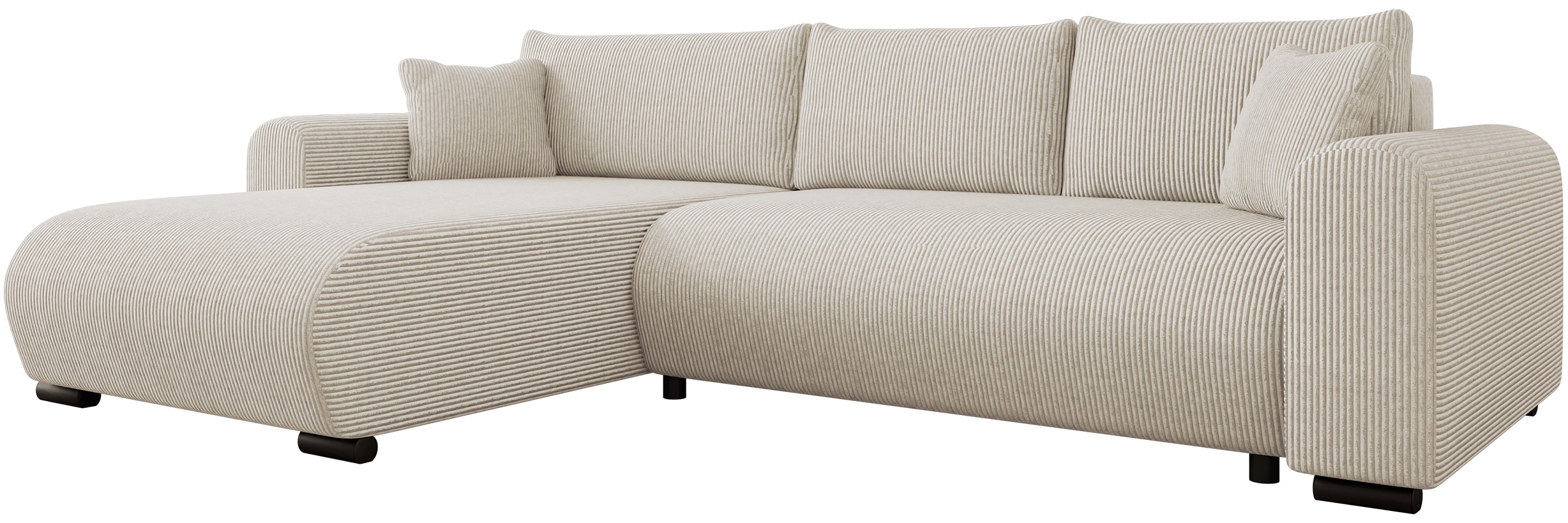 Ecksofa Merkos Cord in der Farbe Poso 100 vereint Funktionalität und Komfort. Mit einer Breite von 285 cm, einer Tiefe von 188 cm und einer Höhe von 80 cm bietet es ausreichend Platz für Entspannung. Die Schlaffläche von 240 x 135 cm und der praktische Bettkasten (136 x 58 x 19 cm) machen es ideal für Gästeübernachtungen. Die Konstruktion aus Nadel- und Laubholz sowie die bequeme Sitzfläche mit Schaumstoff und Wellenfeder sorgen für hohen Sitzkomfort. **Highlights** - Ausziehbares Ecksofa mit Schlaffunktion - Praktischer Bettkasten für zusätzlichen Stauraum - Freistehendes Design mit überzogenem Rücken - Rückenlehne mit beweglichen Kissen für optimalen Komfort - Kissen im Set enthalten **Produkteigenschaften** - Maße (BxTxH): 285 x 188 x 80 cm - Schlaffläche: 240 x 135 cm - Bettkasten: 136 x 58 x 19 cm - Konstruktion: Nadel- und Laubholz + Spanplatte 15 mm - Sitzfläche und Lehne: Schaumstoff T2844 (Dicke: 8 cm) + Wellenfeder des Typs "A" + Watte + Filz - Metall- und Kunststofffüße in Schwarz - Universelle Seitenwahl bei der Montage **Lieferumfang** - Ecksofa Merkos Cord - Kissen im Set enthalten - Montage muss vom Kunden selbst durchgeführt werden - Lieferung nicht auf Inseln und in Bergbewohnungen