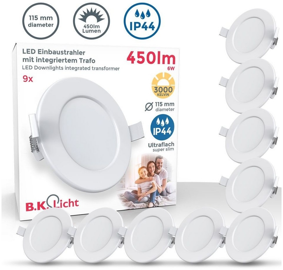 **B.K.Licht I 9er Set LED Bad Einbauleuchten I Ultra Flach 30 mm I Ø100 mm Lochbohrung I Ø115 mm I Weiß I 9x6 W LED I 9x450 Lumen I 3.000 K Warmweiß I IP44 I Bad-Einbaustrahler** ------------------------------------------------------------------------------------------------------------------------------------------------------------------------------------ - Hochwertiges 9er Set langlebiger 6 Watt LED Einbaustrahler Weiß in ultra-flacher Bauweise (30mm). Geringer Verbrauch bei wohlig warmen Licht durch eine Farbtemperatur von 3.000 Kelvin. Geeignet für Badezimmer durch Spritzwasserschutz IP44 - Durch einen integrierten Trafo können die Einbauleuchten einfach an Ihren 230 Volt Anschluss angeschlossen werden. Ein Farbwiedergabewert von CRI>80 verspricht natürliche Farben direkt nach dem Einschalten - Für eine natürliche und großflächige Ausleuchtung Ihres Wohnraumes sorgen die Module der LED Strahler. Blendfrei und augenschonend strahlen sie mit je 450 Lumen - Maße der Deckenstrahler: Außen: 115mm - Einbautiefe: 30mm - benötigter Deckenausschnitt: 100mm. Die stromsparenden 6 Watt LED Spots haben eine Lebensdauer von 25.000 Stunden - Bei diesem Produkt handelt es sich um ein umgebendes Produkt. Umgebende Produkte sind Leuchten, die zur separaten Überprüfung der enthaltenen Lichtquelle(n) zerlegt werden können ### **Technische Daten der Leuchte:** - Material: Kunststoff - Farbe: weiß - Schutzart: IP44 - Spannung: 230V (kein Trafo erforderlich) - Leuchtmittel: LED Modul 6 Watt - Farbtemperatur: 3.000 Kelvin (warmweiß) - Lichtleistung: 450 Lumen (pro Spot) - Lebensdauer ca.: 25.000 Stunden - Nicht dimmbar - Außendurchmesser: 115 mm - Deckenausschnitt: 98 mm - Einbautiefe 30 mm \[ultra-flach\] ### **Lieferumfang:** - 9x Einbaustrahler inkl. Leuchtmittel