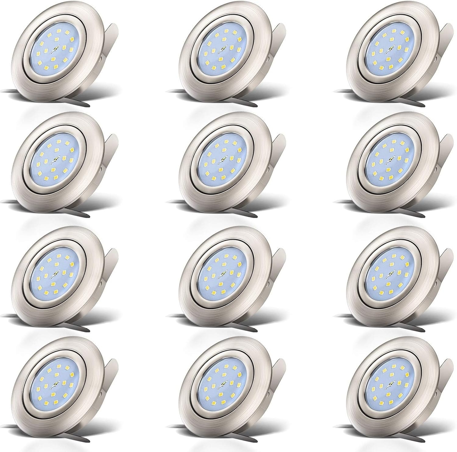**B.K.Licht I 6/12er Set schwenkbare LED Einbaustrahler I Ø68 mm Lochbohrung I Ultra Flache LED Spots 30mm I inkl. 6x5W LED Module I 400lm I warmweiße Lichtfarbe I IP23 Einbauleuchten I Deckenspot I Matt Nickel** --------------------------------------------------------------------------------------------------------------------------------------------------------------------------------------------------------------------- Diese schwenkbaren LED Einbauleuchten präsentieren sich im schlichten Design, angenehm modern und dezent. Einbauleuchten sind universell einsetzbare Lichtspender, die in Wohnräumen, in der Küche, im Flur oder im Treppenhaus eingebaut werden können. Die Lieferung erfolgt mit energiesparenden, warmweißen LED Leuchtmitteln. Der matt-nickel-farbige Rahmen der Einbauleuchte Kiro ist so konstruiert, dass das Leuchtmittel geschwenkt werden kann. So können Sie besonders sehenswerte Stellen in Ihrem zu Hause hervorragend ins rechte Licht rücken. Die Einbauleuchten können ohne Trafo betrieben werden. Mit einer Einbautiefe von 30mm zählt Kiro zu den sogenannten ultra-flachen Einbaustrahlern. Diese können in Decken eingebaut werden, die wesentlich geringer abgehangen sind als bei gewöhnlichen Einbaustrahlern. - Hochwertiges 6/12er Set langlebiger 5 Watt LED Einbaustrahler in ultra-flacher Bauweise (30mm). Geringer Verbrauch bei wohlig warmen Licht durch eine Farbtemperatur von 3.000 Kelvin - Durch einen integrierten Trafo können die schwenkbaren Einbauleuchten einfach an Ihren 230 Volt Anschluss angeschlossen werden. Ein Farbwiedergabewert von CRI>80 verspricht natürliche Farben direkt nach dem Einschalten - Für eine natürliche und großflächige Ausleuchtung Ihres Wohnraumes sorgen die schwenkbaren LED-Spots, die mit einem Abstrahlwinkel von 110° und mit je 400 Lumen strahlen. Einbaumaße: Außen: Ø82mm ; Einbautiefe: 30mm ; benötigter Deckenausschnitt: Ø68 - Die stromsparenden 5 Watt Module haben eine Lebensdauer von 20.000 Stunden - Bei diesem Produkt handelt es sich um ein umgebendes Produkt. Umgebende Produkte sind Leuchten, die zur separaten Überprüfung der enthaltenen Lichtquelle(n) zerlegt werden können ### Technische Daten der der Leuchte: - Material: Kunststoff - Farbe: matt-nickel - Schutzart: IP23 - Spannung: 230V (kein Trafo erforderlich) - Leuchtmittel: LED Modul 5 Watt - Farbtemperatur: 3.000 Kelvin (warmweiß) - Lichtleistung: 400 Lumen (pro Spot) - Lebensdauer ca.: 20.000 Stunden - Abstrahlwinkel: 110 Grad - Nicht dimmbar - Spots sind Schwenkbar - Außendurchmesser: 82 mm - Deckenausschnitt: 68 mm - Einbautiefe 30 mm \[ultra-flach\] ### **Lieferumfang:** - 12x Einbaustrahler inkl Leuchtmittel