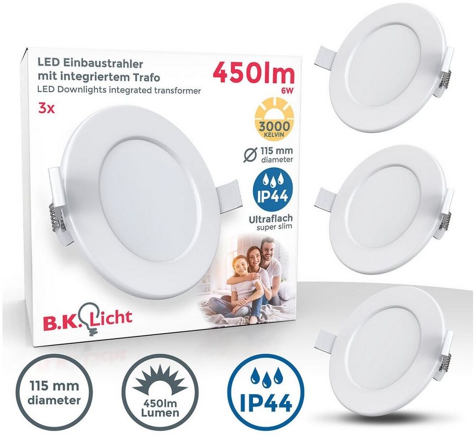 | Name | B.K.Licht LED Einbaustrahler Bad Einbauleuchten 9er Set Ultra-flach Ø115x30mm 230V Weiß - BKL1274, LED fest integriert, Warmweiß, 9 Badezimmer-Einbausprots Decke IP44 230V 6W 450 Lumen 3000K Warmweiß |