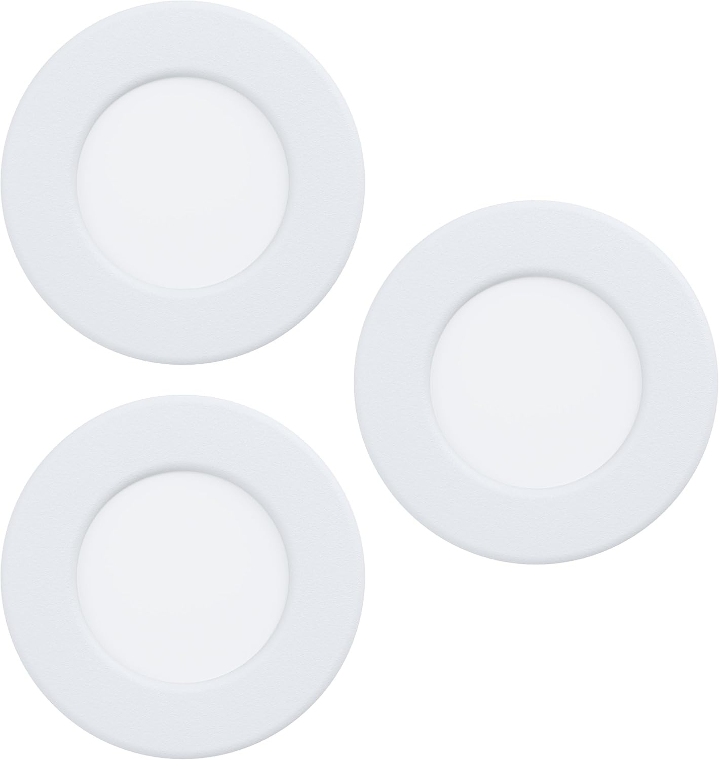 - Das 3er-Set der LED-Einbauleuchte Fueva 5 hat einen Durchmesser von 86 mm und ist aus weißem Metall gefertigt.