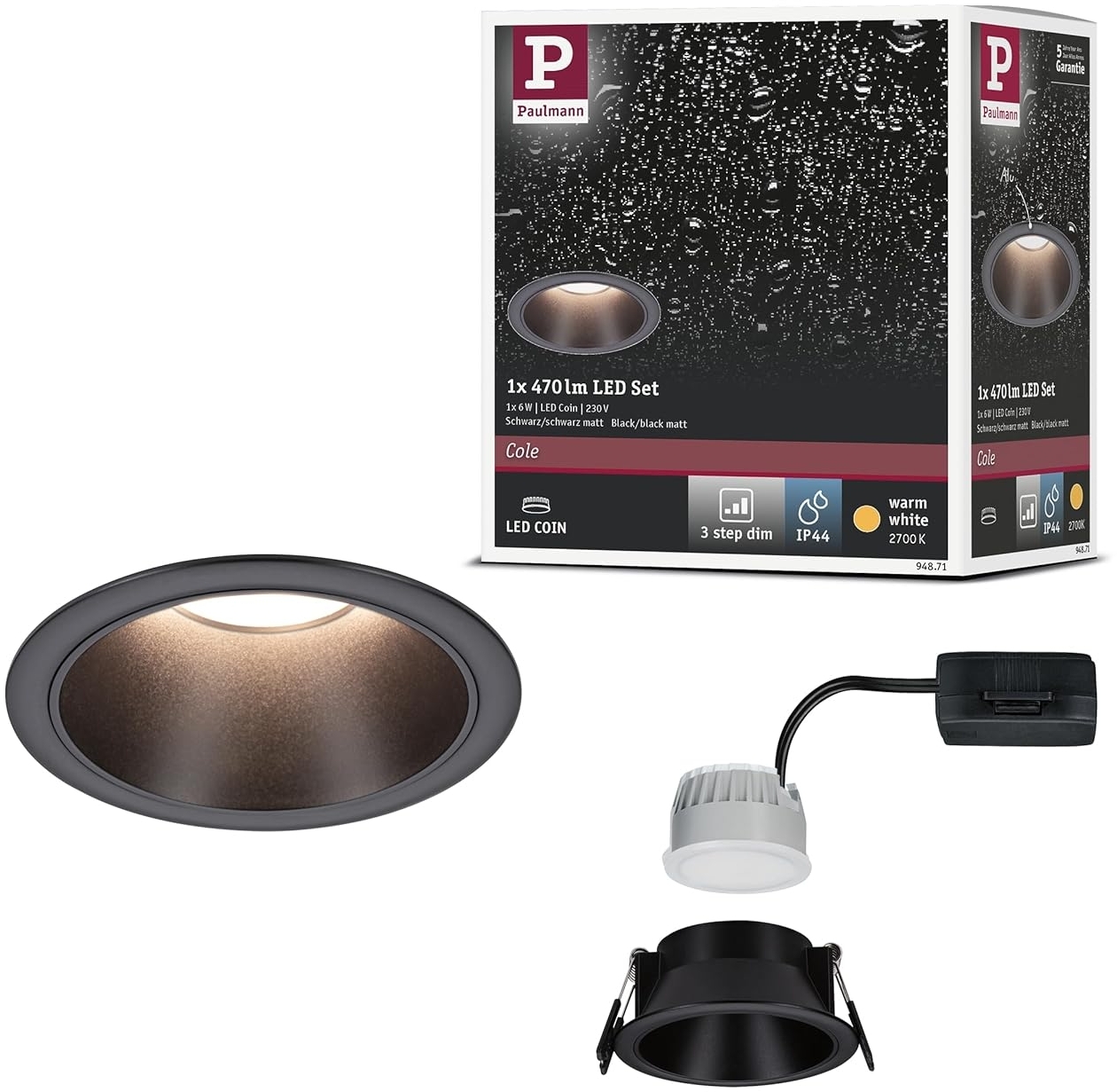 | Name | Paulmann 94871 LED Einbauleuchte Cole Coin 2700K schwarz 3-Step-Dim IP44 |