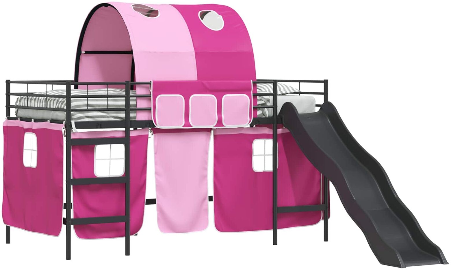 Das vidaXL Loft-Bett für Kinder mit Vorhängen, Wölbung und Rutsche ist die perfekte Kombination aus Spaß und Funktionalität. Der robuste Metallrahmen aus Stahl sorgt für Stabilität und Langlebigkeit, während die sanfte Rutsche und die praktischen Vorhänge das Kinderzimmer in einen abenteuerlichen Rückzugsort verwandeln. Mit seinen kompakten Abmessungen von 205 x 95 x 116 cm (L x B x H) bietet es eine optimale Lösung für aktive Haushalte. **Highlights** - Robuster Metallrahmen für Langlebigkeit und Stabilität - Vollendetes Kopfteil, das Platz spart und elegant aussieht - Praktische Vorhänge aus atmungsaktivem Mesh-Material - Fester Plattform-Lattenrost für erholsamen Schlaf - Sanfte Rutsche für sicheren Spaß beim Aufstehen und Zubettgehen **Produkteigenschaften** - Farbe: Schwarz und Pink - Rahmenmaterial: Stahl - Gesamtabmessungen: 205 x 95 x 116 cm (L x B x H) - Matratzengröße: Kurzes Einzelbett (90x190 cm oder 35" x 75") - Atmungsaktives Material - Langlebig - Montage erforderlich: Nein - EAN: 8721359328394 - SKU: 42020846 - Brand: vidaXL
