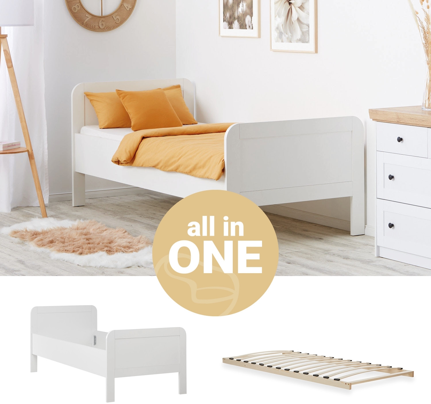 | Lieferumfang | 1x Bettgestell, 1x Lattenrost, Montagezubehör, Aufbauanleitung |