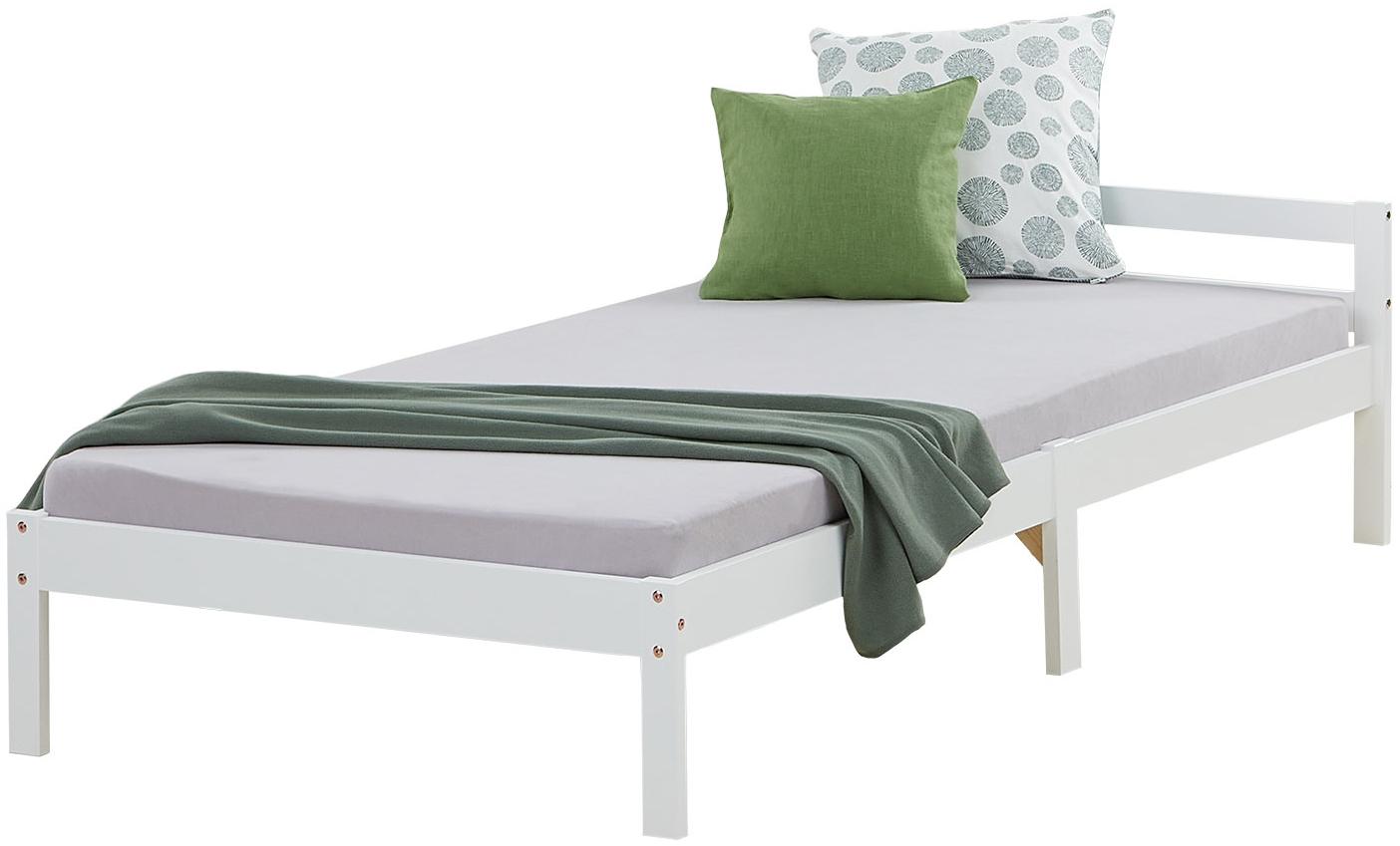 Unser komfortables Holzbett 90x200 cm begeistert vor allem durch seine natürliche Schönheit, dem zeitlosen Design und der stabilen Verarbeitung. Ob im Schlafzimmer, Jugendzimmer oder Gästezimmer - das Bett lässt sich aufgrund seines dezenten Designs perfekt in jeden Schlafraum integrieren. Passend zum Bettgestell gibt es ein Rolllattenrost kostenfrei dazu. Die Matratze sowie Dekoration sind nicht inklusive. • Einzelbett 90x200 cm • Bettgestell mit Lattenrost • abgerundete Kanten und Pfosten **Maße**: • Liegefläche: 90x200 cm • Bett Außenmaß (B x T): 96x206 cm • Höhe Kopfteil: 50 cm • Oberkante Bettseite: 30,5 cm • Stauhöhe unter dem Bett: 21 cm • Einlegetiefe Matratze: 3,5 cm • Materialstärke: 20 mm • Rollrost: 13 Leisten **Material & Farbe:** • Kiefernholz • weiß lackiert