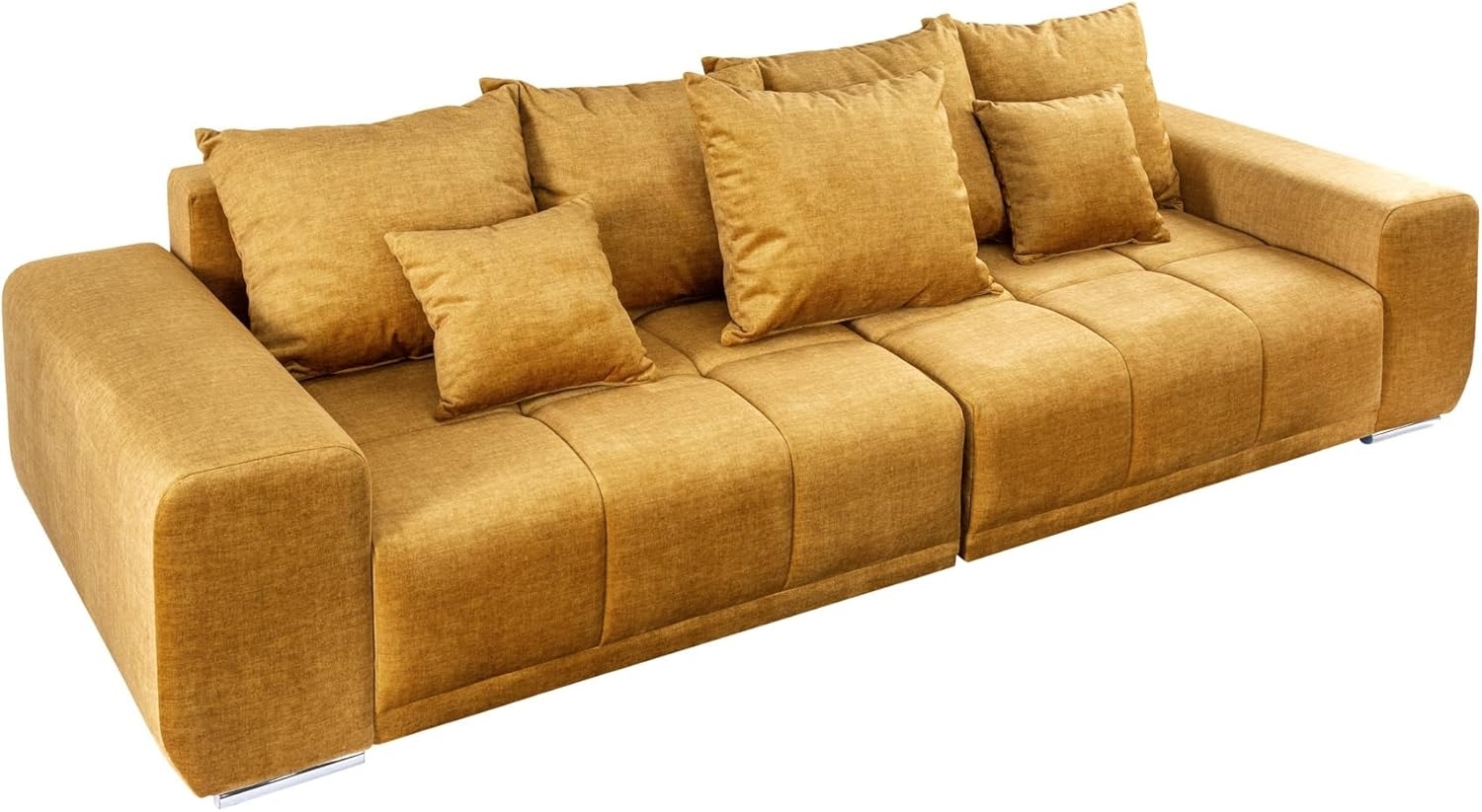 Das Big-Sofa ELEGANCIA in senfgelb ist ein elegantes Möbelstück, das modernen Stil mit hohem Sitzkomfort vereint. Mit einer Breite von 285 cm und einer komfortablen Federkern-Polsterung bietet es ausreichend Platz für entspannte Stunden. Der Bezug aus 100 % Polyester in Samtoptik und die silbernen Füße verleihen dem Sofa eine edle Note. Alle Rücken- und Zierkissen sind im Preis enthalten, während der Hocker nicht im Lieferumfang enthalten ist. **Highlights** - Elegante Ziersteppung für eine ansprechende Optik - Komfortable Federkern-Polsterung für hohen Sitzkomfort - Rücken echt bezogen, ideal für die freie Platzierung im Raum - Alle Rücken- und Zierkissen im Preis enthalten - Nachhaltiger Rahmen aus massivem Buchenholz **Produkteigenschaften** - Farbe: Bezug in senfgelb, Füße in silber - Material: Bezug aus Samt (100 % Polyester), Gestell aus Buchenholz, Füße aus Kunststoff - Maße: 285 cm Breite - Hocker nicht im Lieferumfang enthalten **Lieferumfang** - 1x Big-Sofa ELEGANCIA - Alle Rücken- und Zierkissen - Hocker nicht im Lieferumfang enthalten