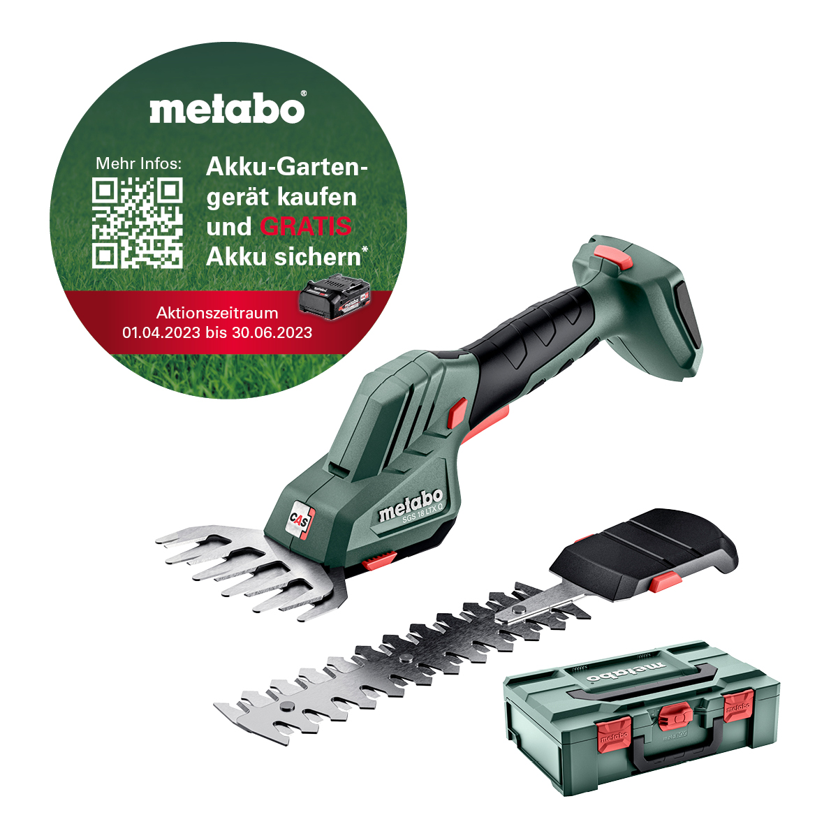 | Lieferumfang | Akku-Schere, Strauchmesser, Grasmesser, Aufbewahrungsschuber, metaBOX 145 L, ohne Akkupack, ohne Ladegerät |