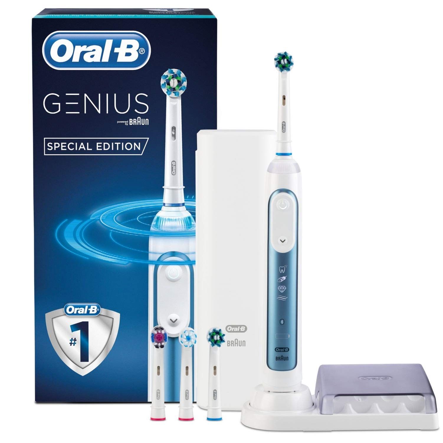 1 Handstück, 2 Bürstenköpfe, 1 Reiseetui, 1 Ladeglas