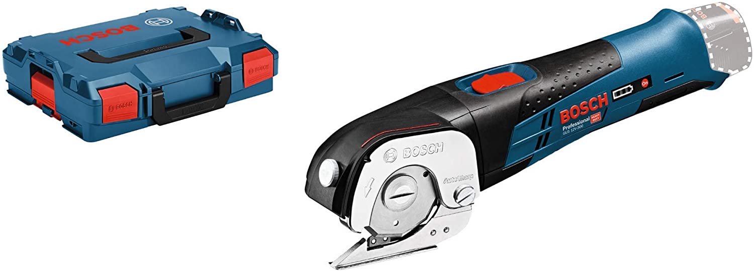 - Die BOSCH Professional GUS 12V-300 Akku-Schere verfügt über eine selbstschärfende Universalklinge, die mühelos durch verschiedene Materialien wie PVC und Leder schneidet.