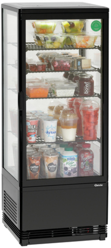 - Die Bartscher Mini-Kühlvitrine hat ein Fassungsvermögen von 98 Litern, was sie ideal für den Einsatz in kleinen Gewerbebetrieben macht.