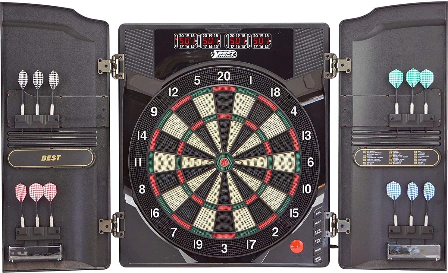 | Name | Best Sporting Dartscheibe elektronisch Oxford 2. 0 I elektronische Dartscheibe mit LED-Anzeigen I E-Dartscheibe mit 12 Dartpfeilen & Ersatzspitzen I Dartboard Kabinett mit Walnuss-Optik |