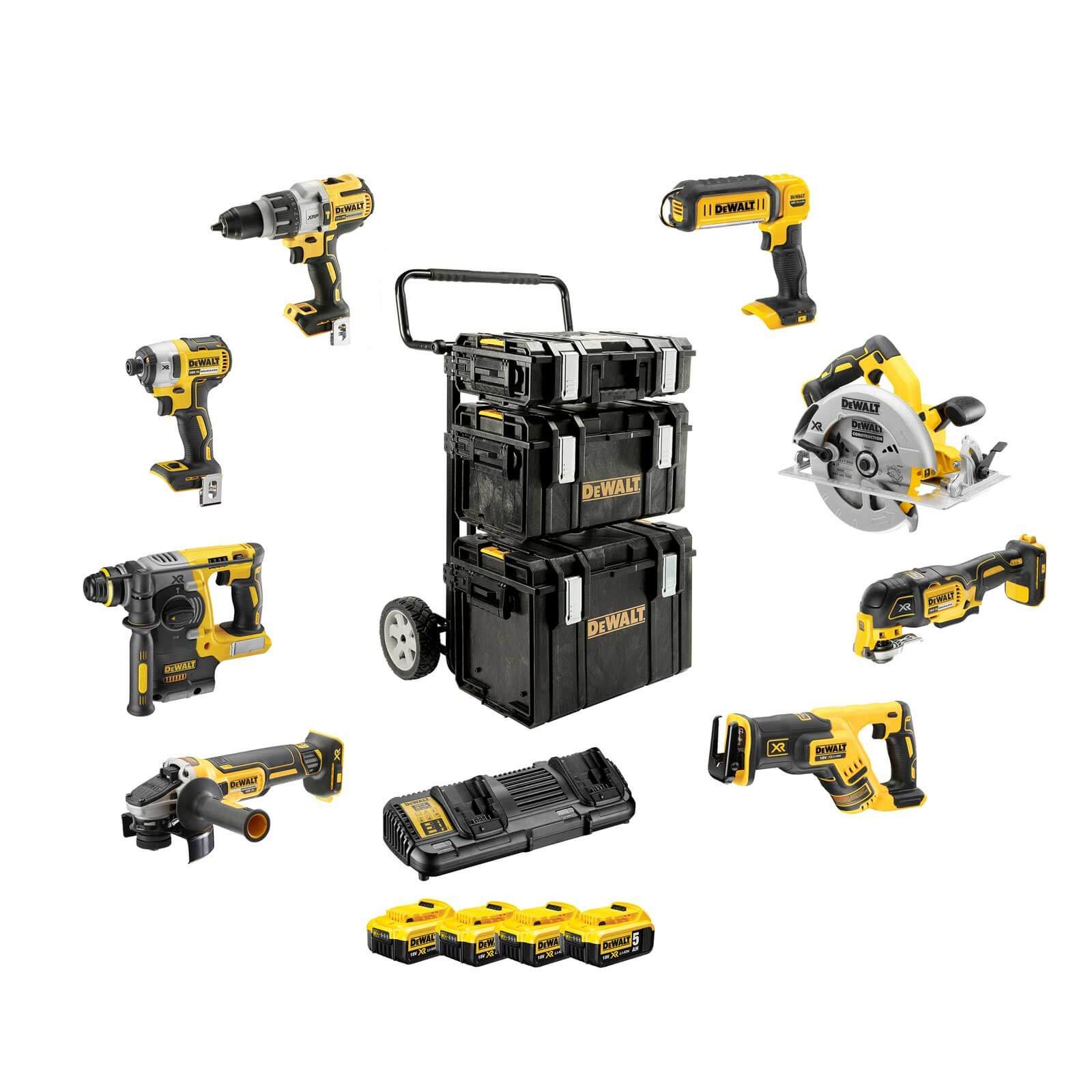 DeWalt DCK853P4 18 V5.0 Ah Profi Kombo-Pack (bestehend aus: Schlagbohrschrauber, Schlagschrauber, Kombi-Hammer, Winkelschleifer, Säbelsäge, Multi-Tool, Handkreissäge, LED-Leuchte, 4x Akkus, Tough-System), 18 V
