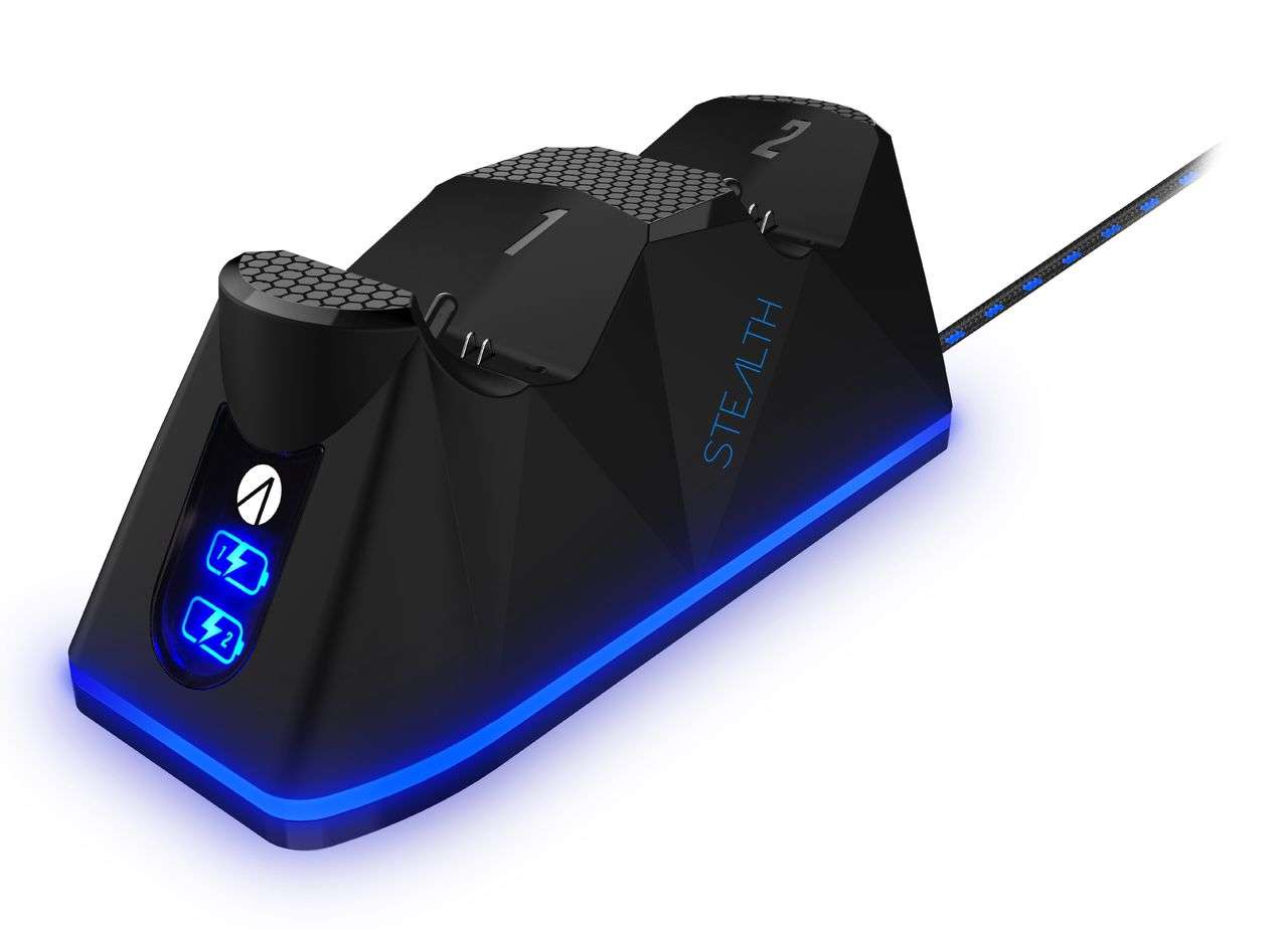 - Das Dock kann bis zu zwei DS5-Controller gleichzeitig aufladen und verfügt über nummerierte Schlüssel mit einem pulsierenden Stealth-Logo.