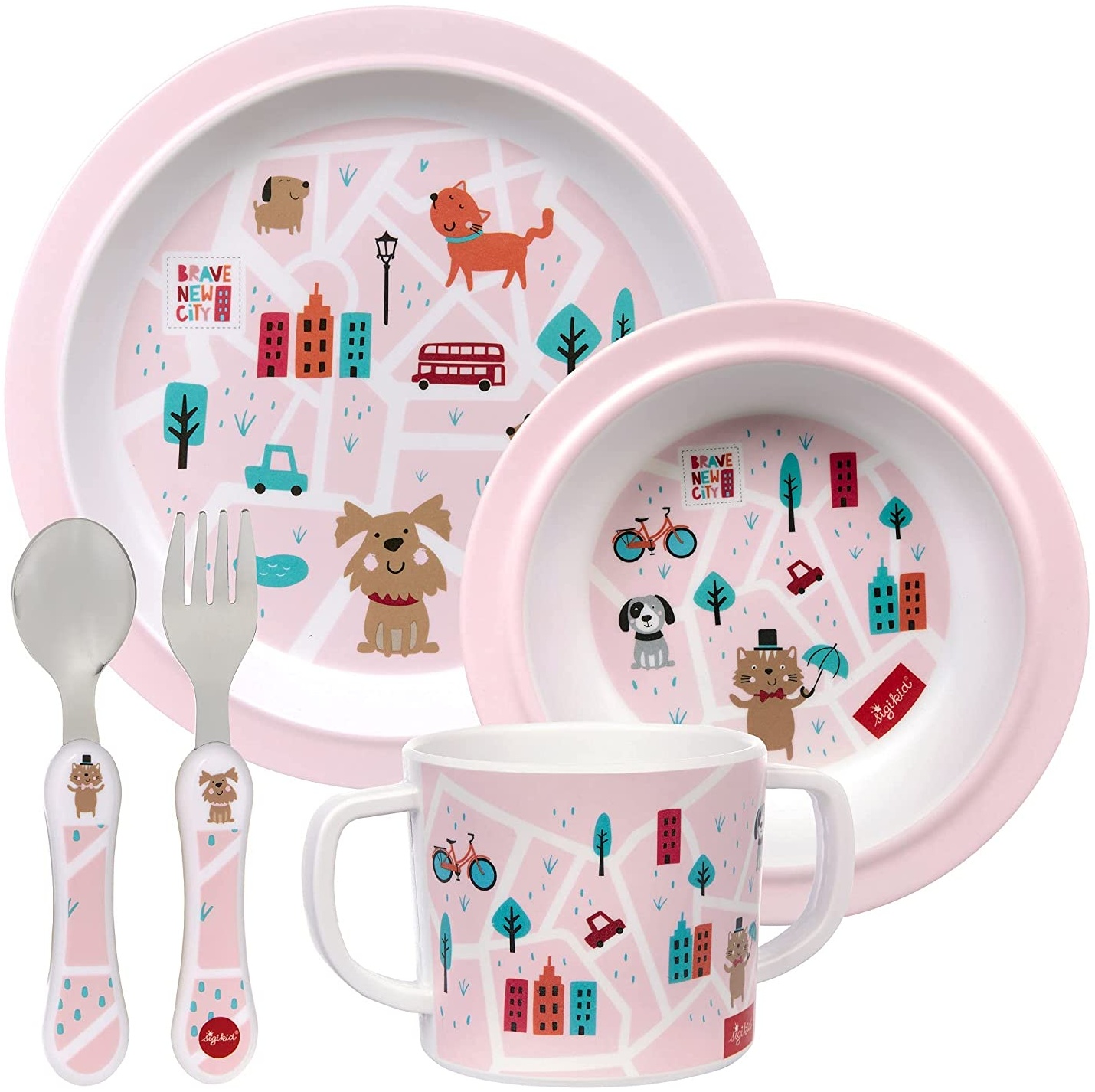 Mmmmhhh, ist das lecker, denn das Auge isst auch schon bei den Kleinsten mit! Das rosafarbene Kindergeschirr Set mit den lustigen Hunden und Katzen, die in der Stadt unterwegs sind, ist für Kinder ab dem Beikost-Alter vorgesehen. Aufgrund seiner schönen Verpackung in der Geschenkbox ist das Melamin-Set auch prima als Geschenk zur Geburt oder Taufe geeignet. Das Design ist liebevoll und kindgerecht. Das Set besteht aus einer Tasse ( 7,5 cm) mit zwei Griffen, einem Teller ( 21,5 cm), einer Schüssel ( 15,5 cm) und dem Besteck (14 cm) – perfekt für eine Kinderportion! Der Teller wurde mit einem abgeschrägten Rand versehen, so werden die ersten Essversuche zum Kinderspiel. Die dazugehörige Tasse lässt sich mit zwei Griffen sicher anheben und festhalten. Die Gummiringe am Boden des Geschirrs machen es rutschfest und sorgen somit für guten Halt auf dem Tisch. Des Weiteren kann das Essen mit dem kindgerechten Besteck problemlos aufgenommen werden. Die Kunststoff-Griffe (ABS) von Löffel und Gabel sind breit genug, so dass das Kind das Besteck sicher in der Hand halten und zum Mund führen kann – perfekt für erste selbständige Essversuche. Das Melamin-Set ist somit der perfekte Begleiter für die Kleinsten, um sich an die erste selbstständige Nahrungsaufnahme zu wagen. Das Baby-Geschirr besteht zu 100% aus Melamin, ist für Lebensmittelkontakt geeignet und ist selbstverständlich BPA-frei. Es ist spülmaschinengeeignet, aber ACHTUNG! es ist nicht für die Mikrowelle geeignet. Melamingeschirr darf nicht über 70°C erhitzt werden. Warme Getränke und Speisen bitte erst abkühlen lassen und niemals über 70 °C heiß einfüllen. Melamin ist generell sehr robust, aber nicht unzerbrechlich. sigikid legt besonderen Wert auf ausgesuchte Materialien und durchdachtes Design. Die Marke sigikid steht für kindgerechte Produkte, die Emotionen wecken und Eltern und Kindern gleichermaßen ein gutes Gefühl vermitteln. Seit über 50 Jahren folgt sigikid einem klaren Leitsatz: FIRST CLASS FOR KIDS! Wir machen die Welt von Familien von Anfang an kuscheliger und bunter.