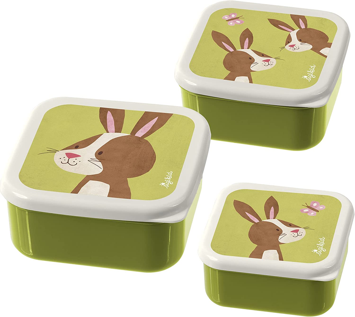 3er-Set Snackboxen – Die nimmt man gerne mit! Die drei Snackboxen in frischem Grün und mit süßem Häschen Motiv eignen sich hervorragend als Geschenk für Mädchen ab 2 Jahren. Sie sind der perfekte Begleiter – egal ob für die Krippe oder den gemeinsamen Familienausflug in die Natur. Durch ihre kindgerechte Form lassen sie sich perfekt von kleinen Kinderhänden greifen. Das Öffnen und Schließen ist ebenso leicht möglich. Das Set besteht aus drei Größen (500 ml – 350 ml – 230 ml), somit bekommt man jede Mahlzeit unter - seien es kleine Knabbereien oder leckere Schulbrote. Aber auch für das Aufbewahren kleiner Schmuckstücke aus dem Kinderzimmer eignen sich die Boxen super! Des Weiteren passen die Dosen ideal ineinander und sparen so Platz beim Verstauen. Die Snackboxen bestehen aus lebensmittelechtem Polypropylen (PP), sie kommen völlig ohne Weichmacher aus und sind somit natürlich BPA-frei. Das Material weist eine gute Barriere-Eigenschaft gegen Fette und Feuchtigkeit auf und ist auch gegen schwache Säuren von z. B. Obst oder Essiggurken beständig. Darüber hinaus ist PP bis zu 100 Grad hitzebeständig und gut recyclebar. Die Döschen können in der Spülmaschine gereinigt werden. Die Deckel wiederum sollten per Hand gespült werden, um das schöne Motiv zu schonen. sigikid legt besonderen Wert auf ausgesuchte Materialien und durchdachtes Design. Durch akkreditierte Prüfinstitute finden in der Produktentwicklung und Produktion ständig Prüfungen gemäß den gültigen Normen statt. Dabei sind die festgelegten Richtwerte strenger, als die vom Gesetzgeber vorgeschriebenen Grenzwerte. So bleibt sigikid seinem Leitsatz treu: FIRST CLASS FOR KIDS. Wir machen die Welt für Familien von Anfang an kuscheliger und bunter.