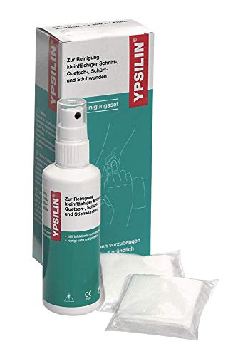 - Das Ypsilin Wundreinigungsset Groß enthält Desinfektionsmittel und eine Lösung zum Spülen von Wunden