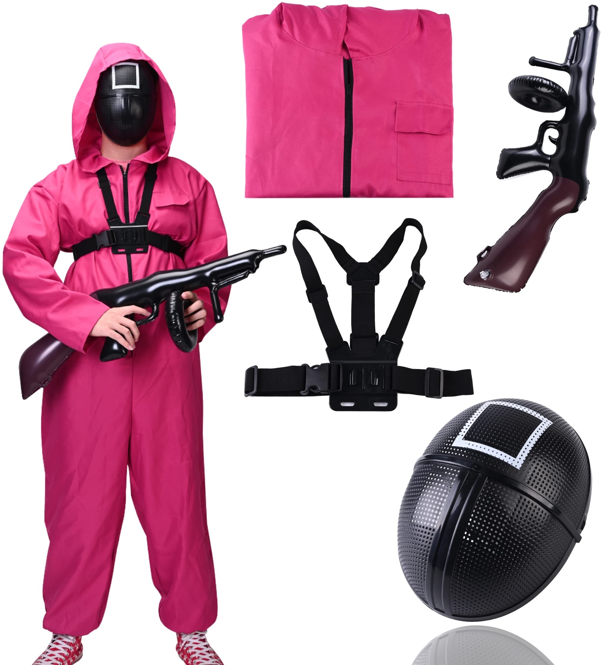 The Game Squid 4 in 1 Unisex - Set Kostüm mit Anzug & Gewehr & Maske - Erwachsene für Fasching & Karneval & Halloween (160-190cm)