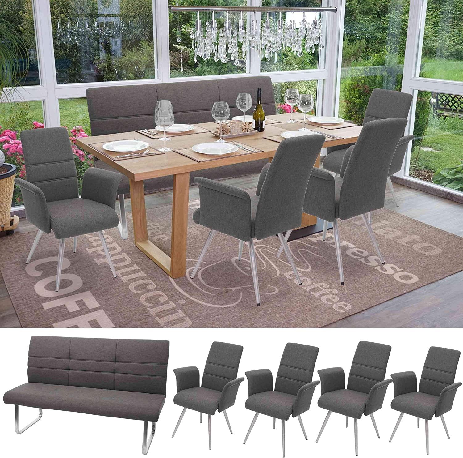 in EssgruppenSet 4x Esszimmerstuhl+Sitzbank HWC-G55Bank Küchenstuhl Stuhl+Armlehne, Stoff/Textil Edelstahl ~ grau-braun Bank 180cm