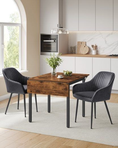 **Produktdetails Tisch:** Farbe: Vintagebraun-Schwarz Material: Holzspanplatte, Stahl Größe aufgeklappt: 120 x 78 x 75 cm (L x B x H) Größe eingeklappt: 84,5 x 78 x 75 cm (L x B x H) Gewicht: 17,5 kg Max. statische Belastbarkeit der mittleren Tischplatte: 100 kg Max. statische Belastbarkeit jeder Tischplatte auf beiden Seiten: 50 kg **Produktdetails Esszimmerstuhl:** Material: Pulverbeschichtete Metallbeine, Holzplatte, Samt, Schaumstoffpolsterung Größe insgesamt: 60 x 62,5 x 85 cm (T x B x H) Sitzhöhe: 50 cm Sitzbreite: 49 cm Sitztiefe: 44,5 cm Höhe Rückenlehne: 39,5 cm Höhe Armlehne: 64 cm Dicke des Sitzpolsters: 7 cm Gewicht: 6,5 kg Max. statische Belastbarkeit: 110 kg **Lieferumfang:** 1 x Esstisch 2 x Zubehörpaket 2 x Anleitung 2 x Esszimmerstuhl **VASAGLE Hinweise:** Kindern ist es aus Sicherheitsgründen untersagt, auf das Produkt zu klettern oder damit zu spielen. Die maximale statische Belastbarkeit pro Stuhl beträgt 100 kg. Bitte überschreiten Sie dieses Maximalgewicht nicht.